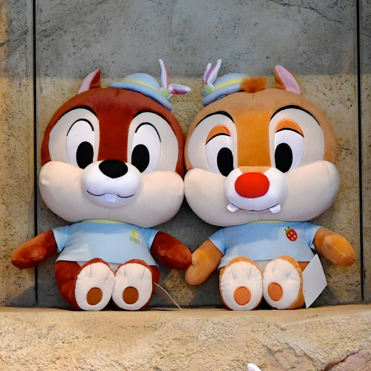 うさみみのついた帽子をかぶったおそろいコスチュームのチップ、デールのぬいぐるみ。