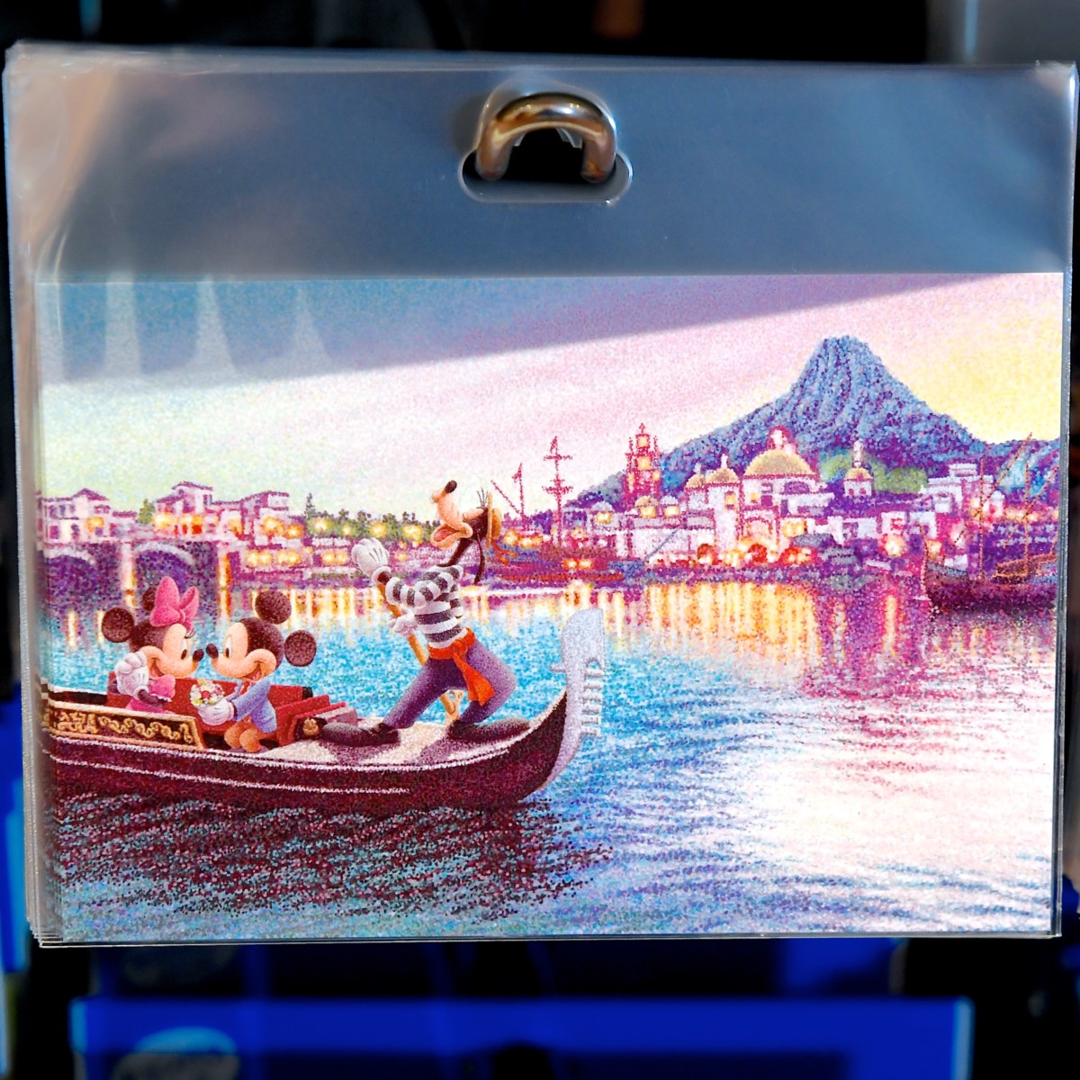 東京ディズニーシーのアトラクション「ヴェネツィアン・ゴンドラ」に乗るミッキー&ミニー、ゴンドリエのグーフィーがデザインされたポストカード。