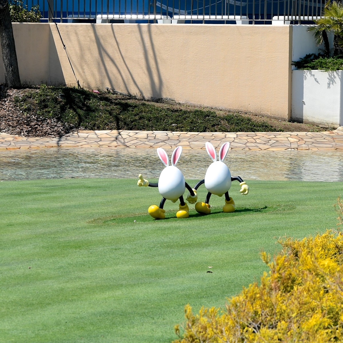 プラザ外周の芝生でゴルフを楽しむうさたまや