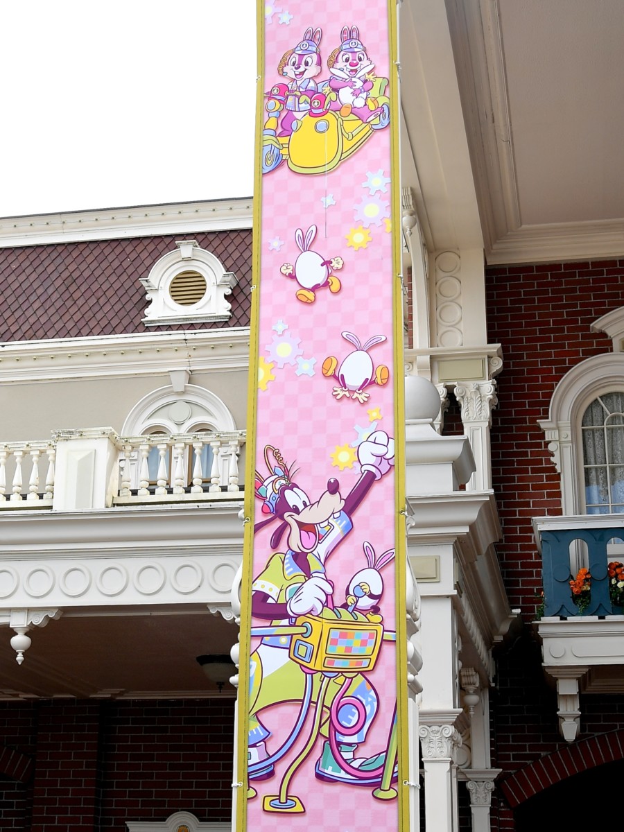 メインパレード『うさたま大脱走!』に登場するミッキーたちがデザインされたバナーが飾り付けられています。