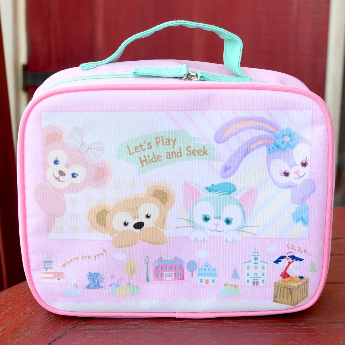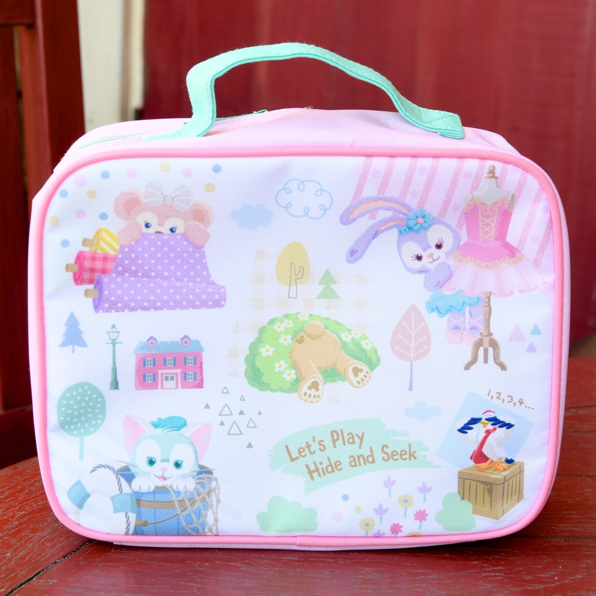 「ダッフィー」、「シェリーメイ」、「ジェラトーニ」、「ステラ・ルー」がかくれんぼをする姿がデザインされています☆