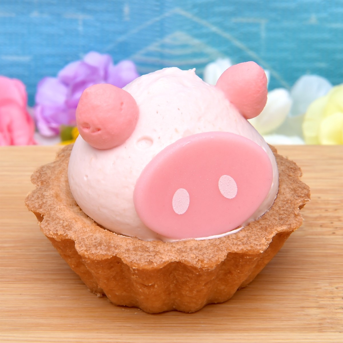 豚の貯金箱「ハム」のプチガトーケーキは「ピーチクリームのタルト」