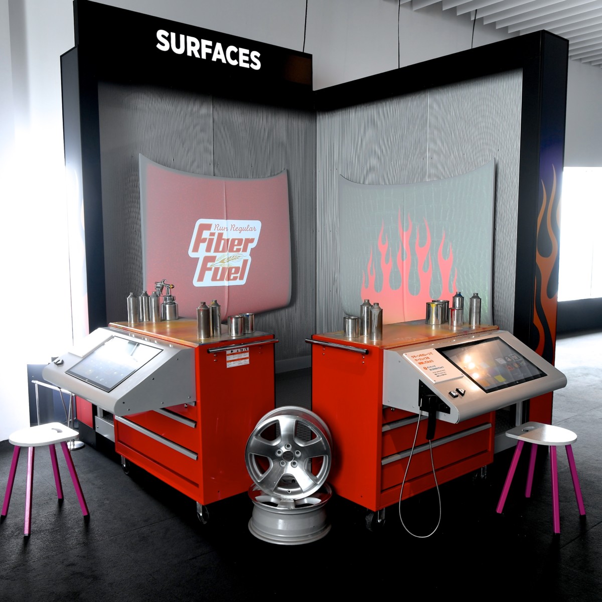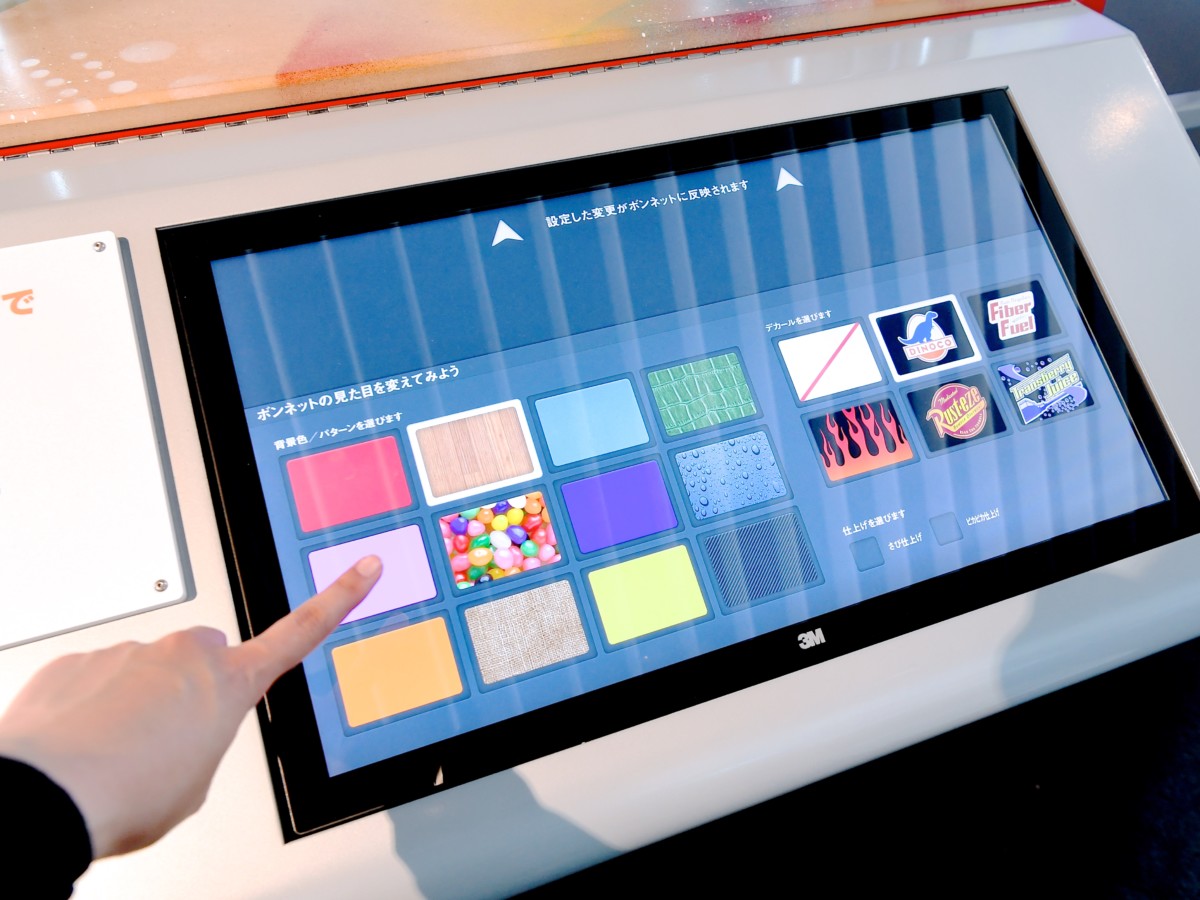 こちらのコーナーでは、タッチスクリーンで車のボンネットをデザインする体験ができます。