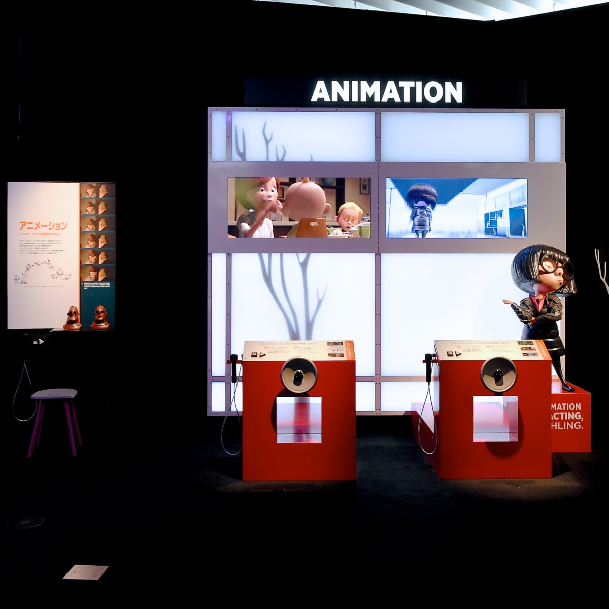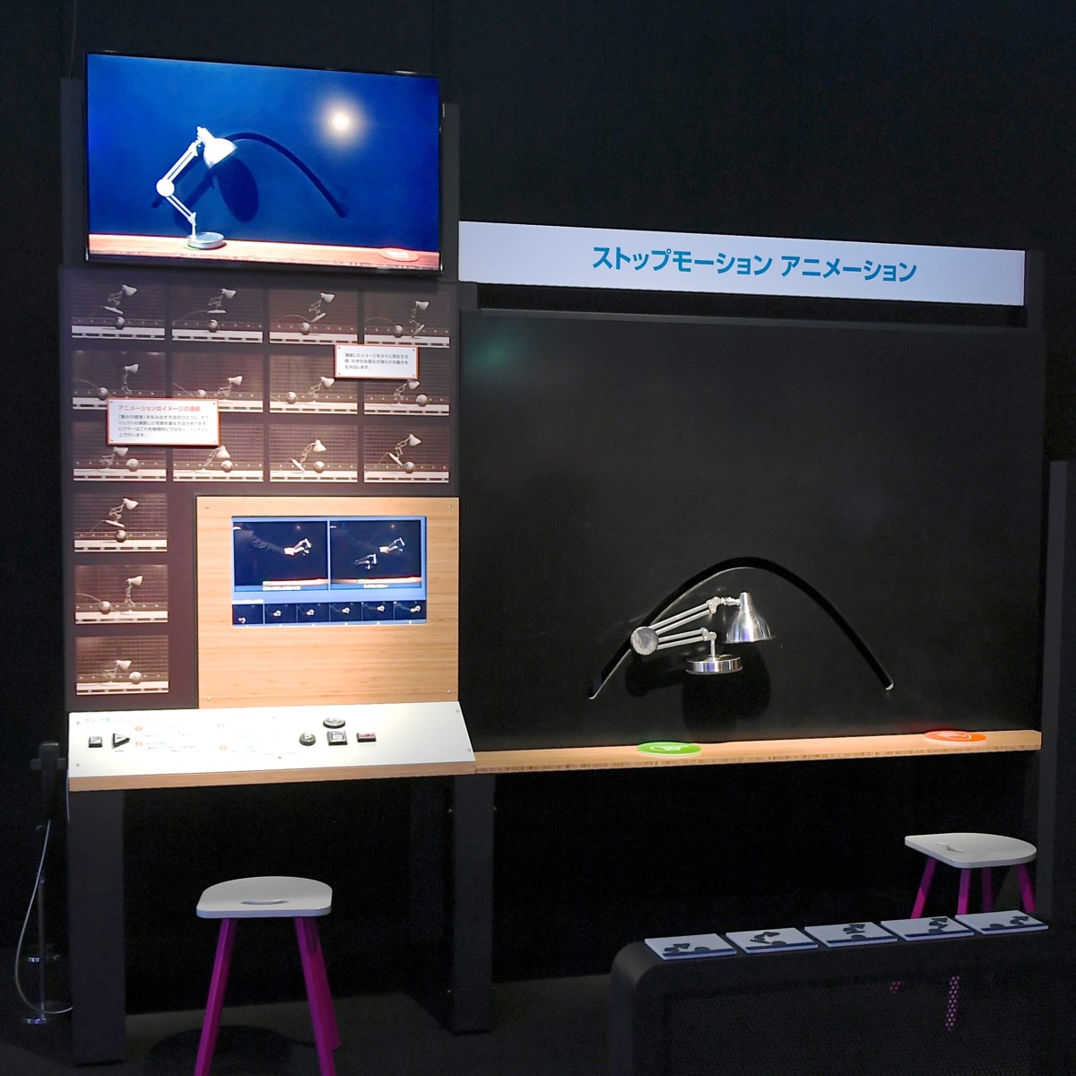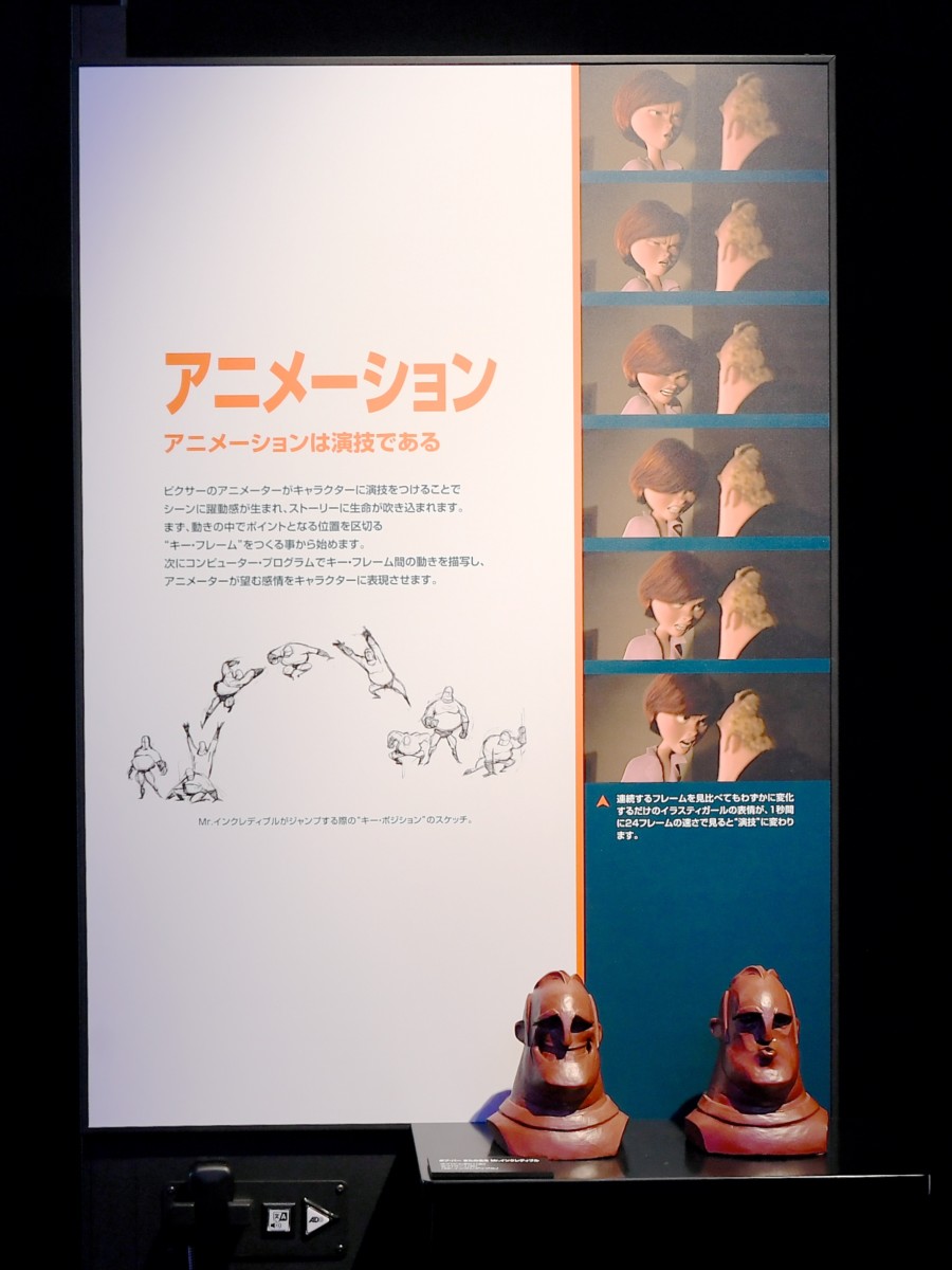 ピクサーの魅力的なキャラクターたちがどのように生みだされ、作品がどのように作られていくのか、実際のアニメーションづくりを自分で体験しながらひみつを解き明かすことができるハンズオン展示になっています☆