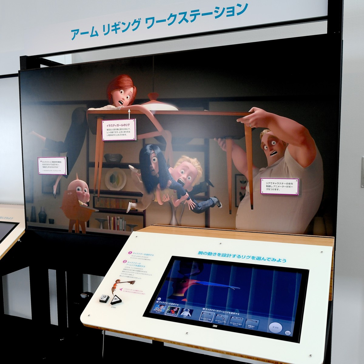 『インクレディブル・ファミリー』の絵がデザインされたアーム リギング ワークステーションでは腕のうごきを設計するリグを選択して、実際に動きを試すことができます。