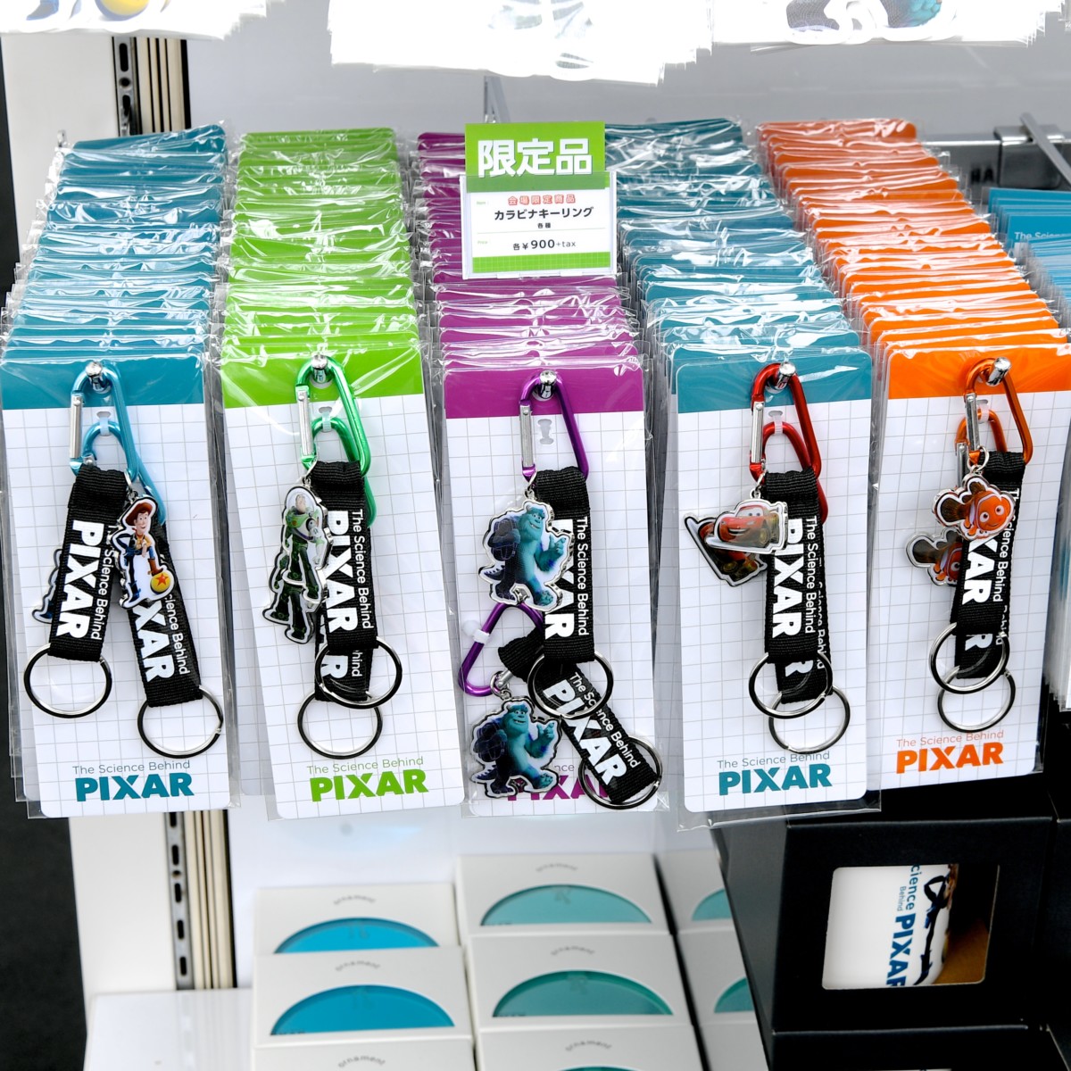「PIXARのひみつ展」のロゴとカラフルなカラビナ、キャラクターのコントラストがおしゃれなカラビナキーリング。