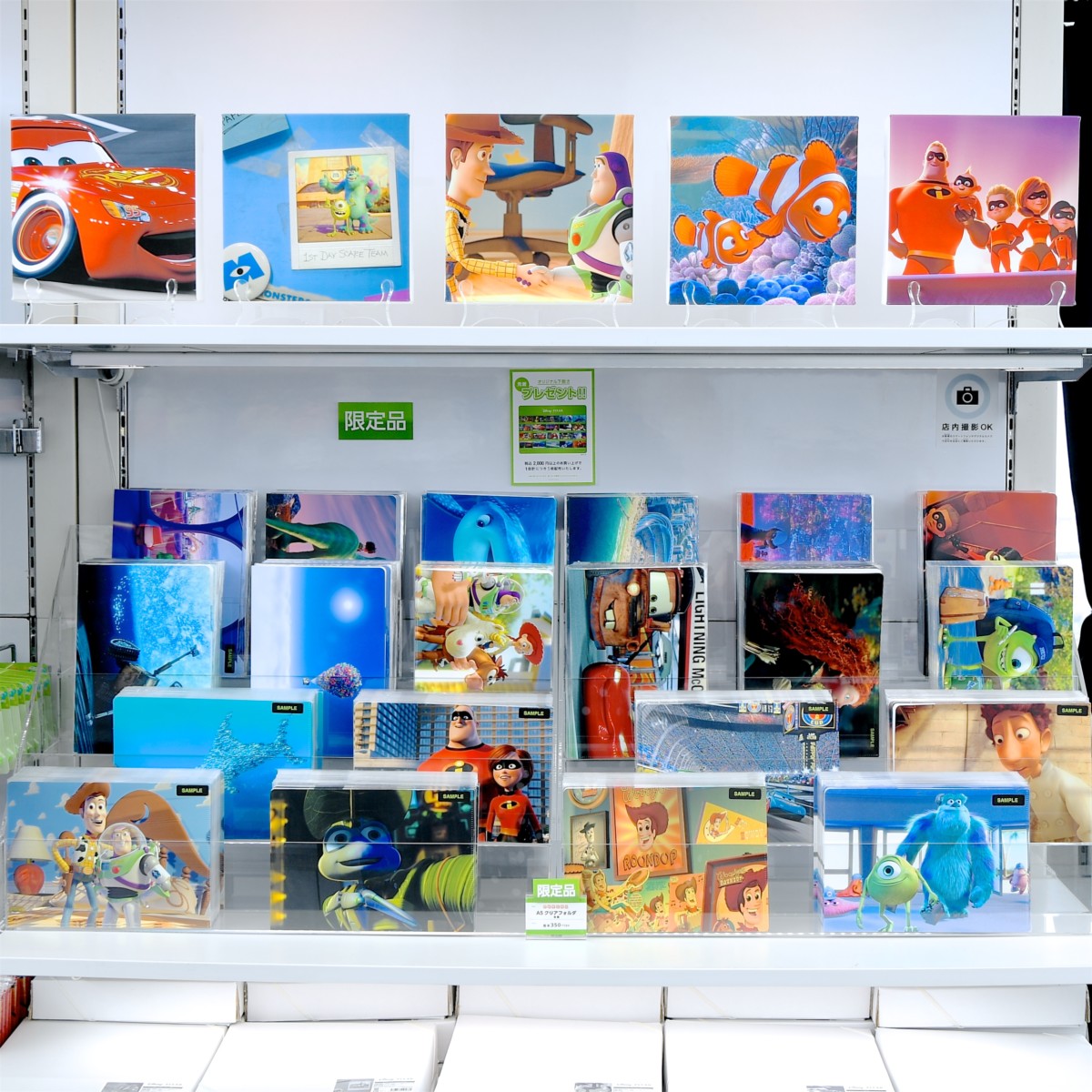 「PIXARのひみつ展スペシャルショップ」にて、オリジナルグッズを合計で税込み2,000円以上お買い上げの方、先着25,000名様を対象にPIXARの人気キャラクターをデザインしたB5サイズのオリジナル下敷きをプレゼント。