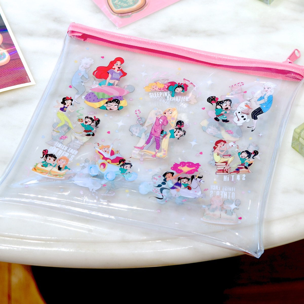 ヴァネロペとカジュアルなコスチュームのディズニープリンセスたちがデザインされたクリアなポーチ。