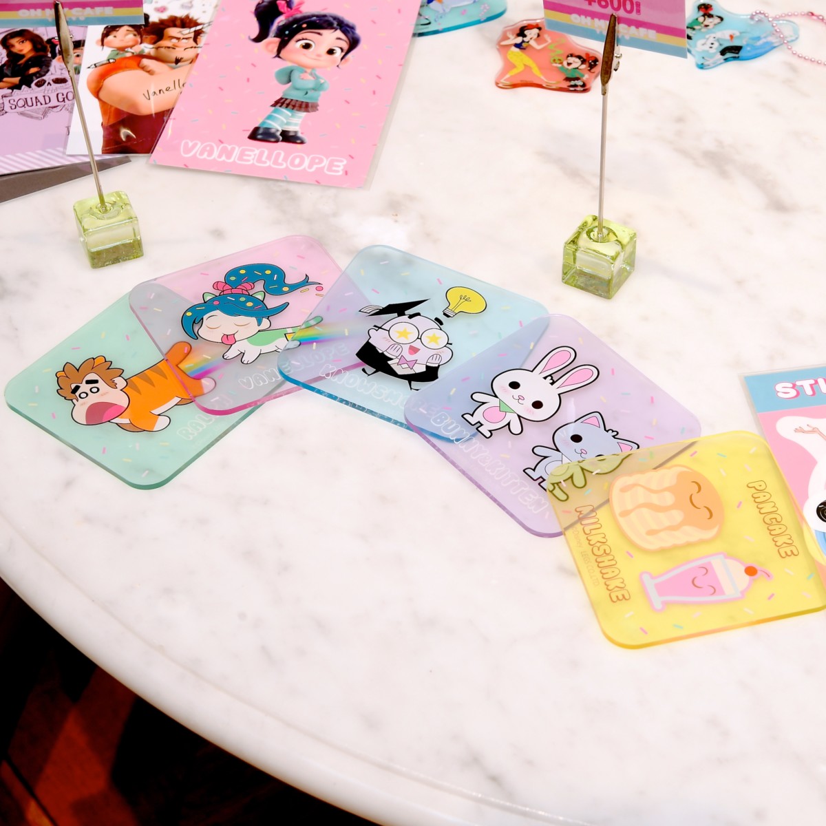 ポップなアートがかわいいパステルカラーのアクリルコースター。