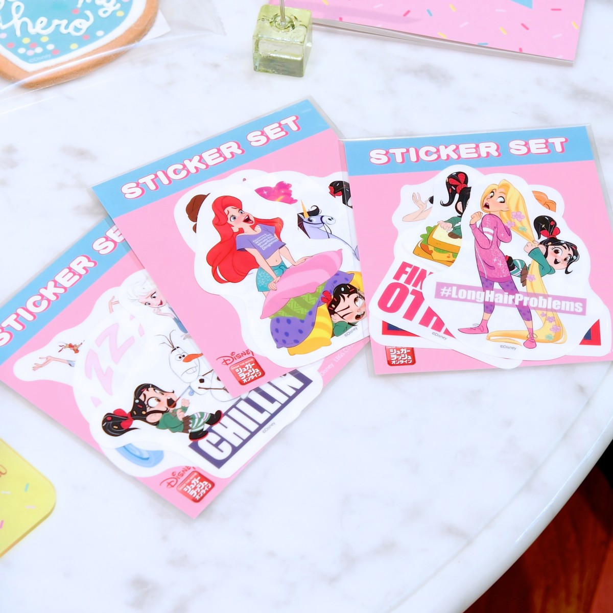ヴァネロペとディズニープリンセスたちがデザインされたダイカットステッカーの3枚セット。