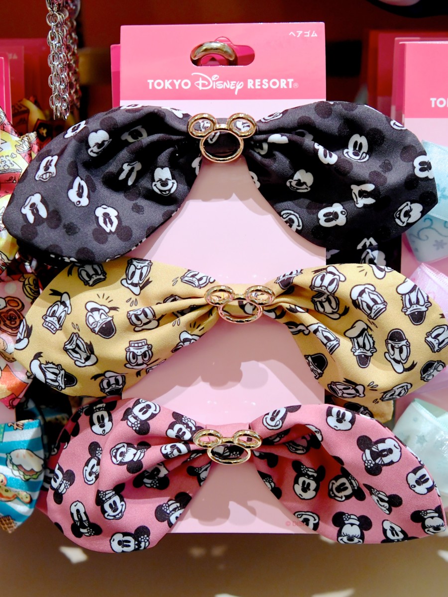 ミッキーマウス、ドナルドダック、ミニーマウスのお顔がデザインされたヘアゴム。