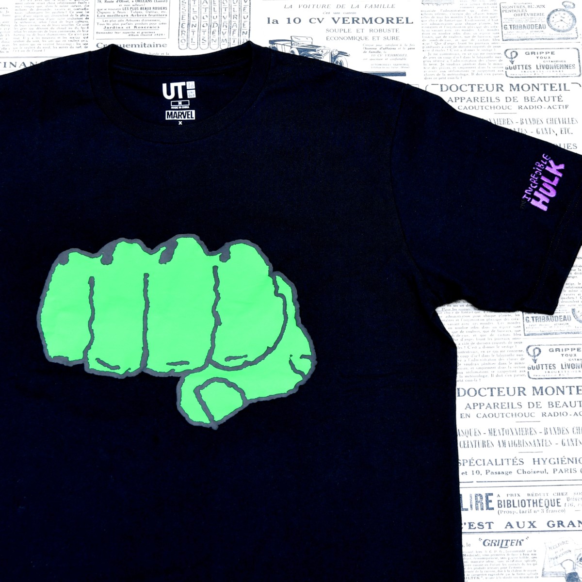 ハルクの拳が大胆に描かれたTシャツ。