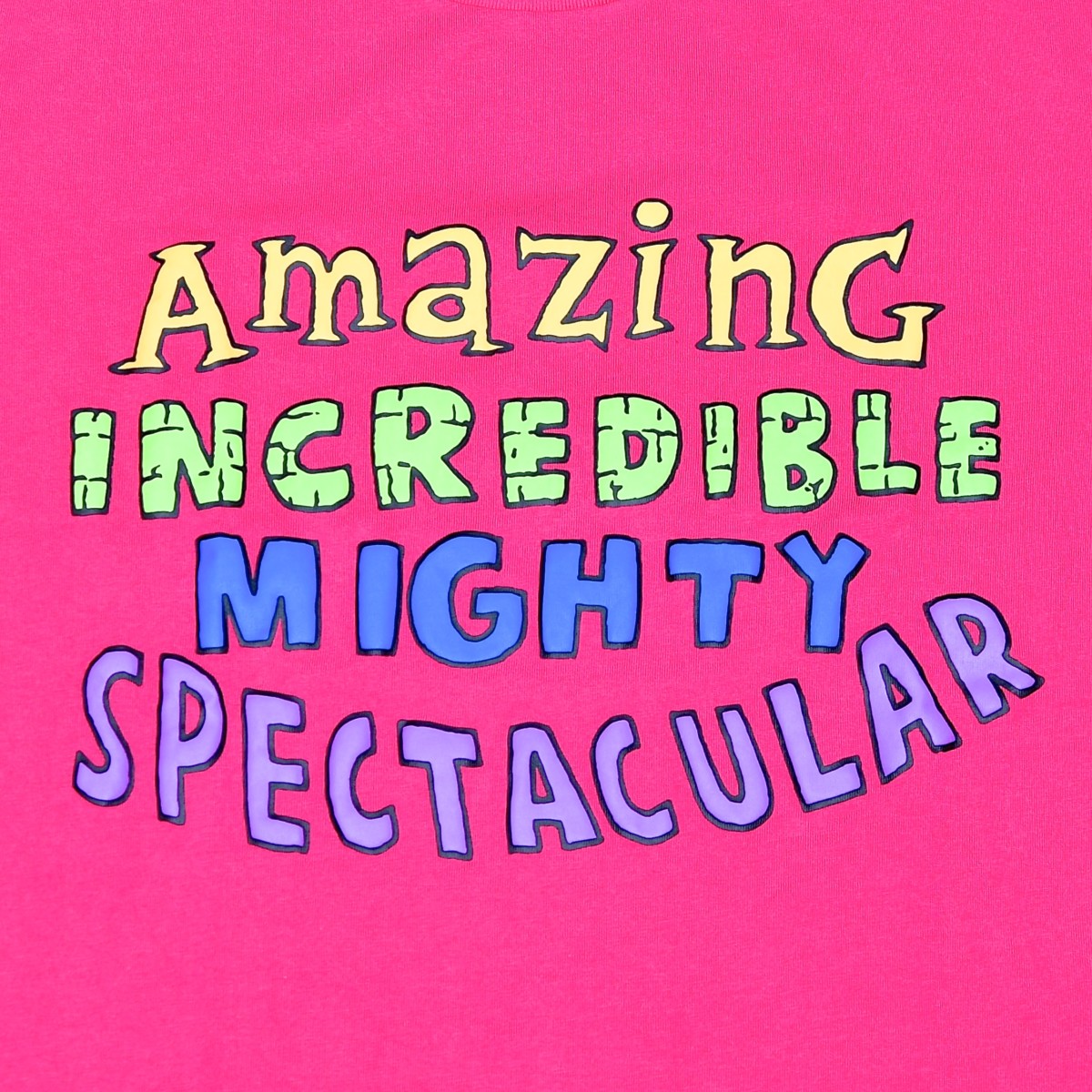 Amazing、INCREDIBLE、MIGHTY、SPECTACULARというスーパーヒーローたちの特徴がポップな文字でデザインされたTシャツ。