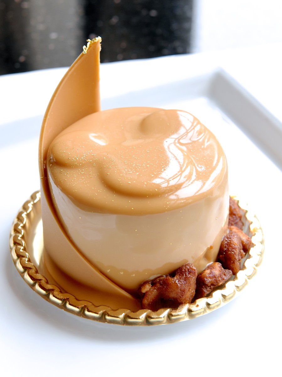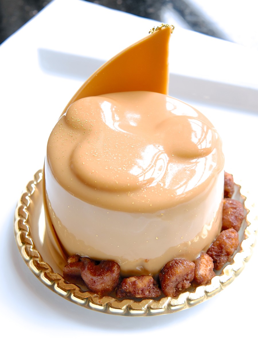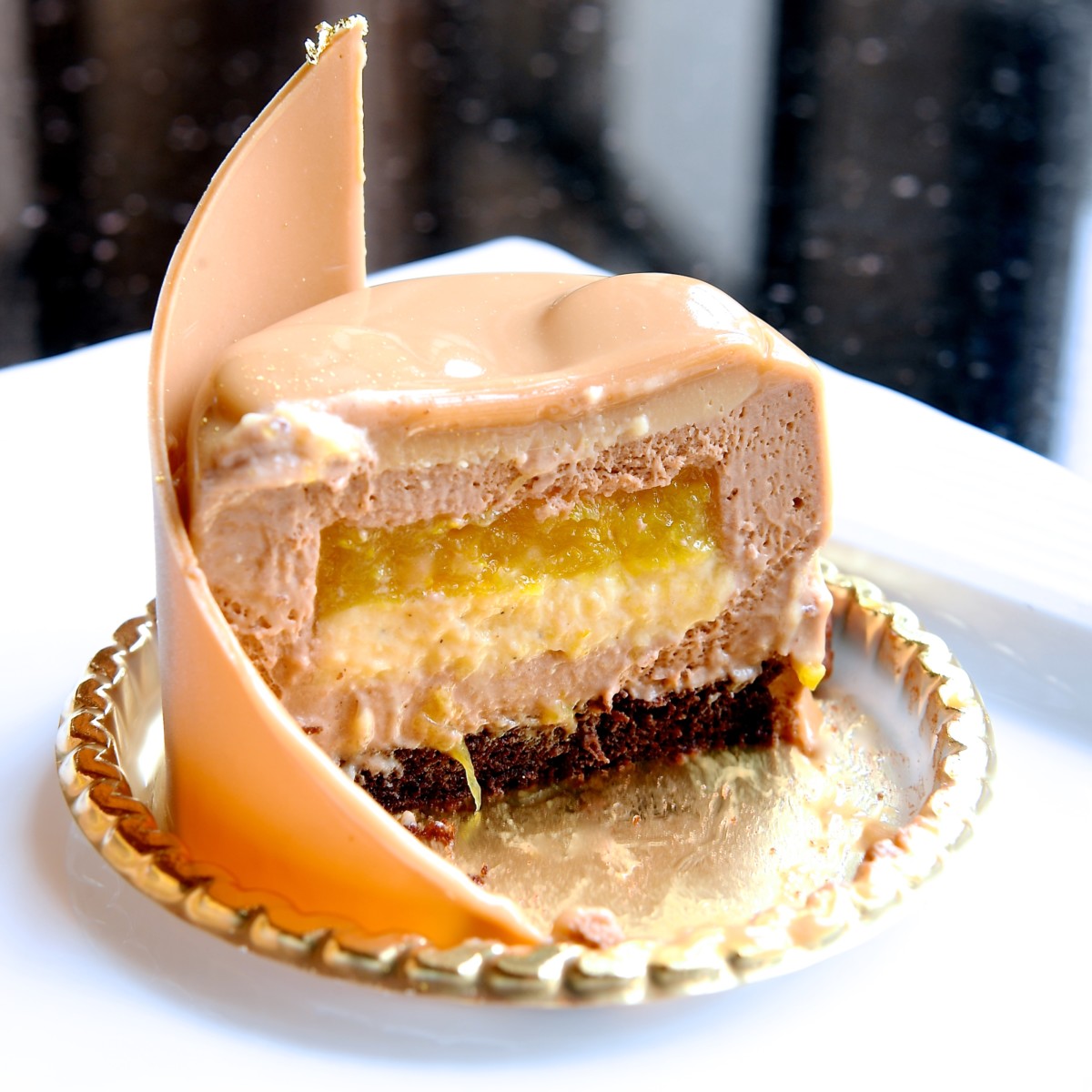 キャラメルチョコレート、キャラメルチョコレートとバニラのムース、オレンジのジュレ、チョコレートスポンジが層になったムースケーキ。
