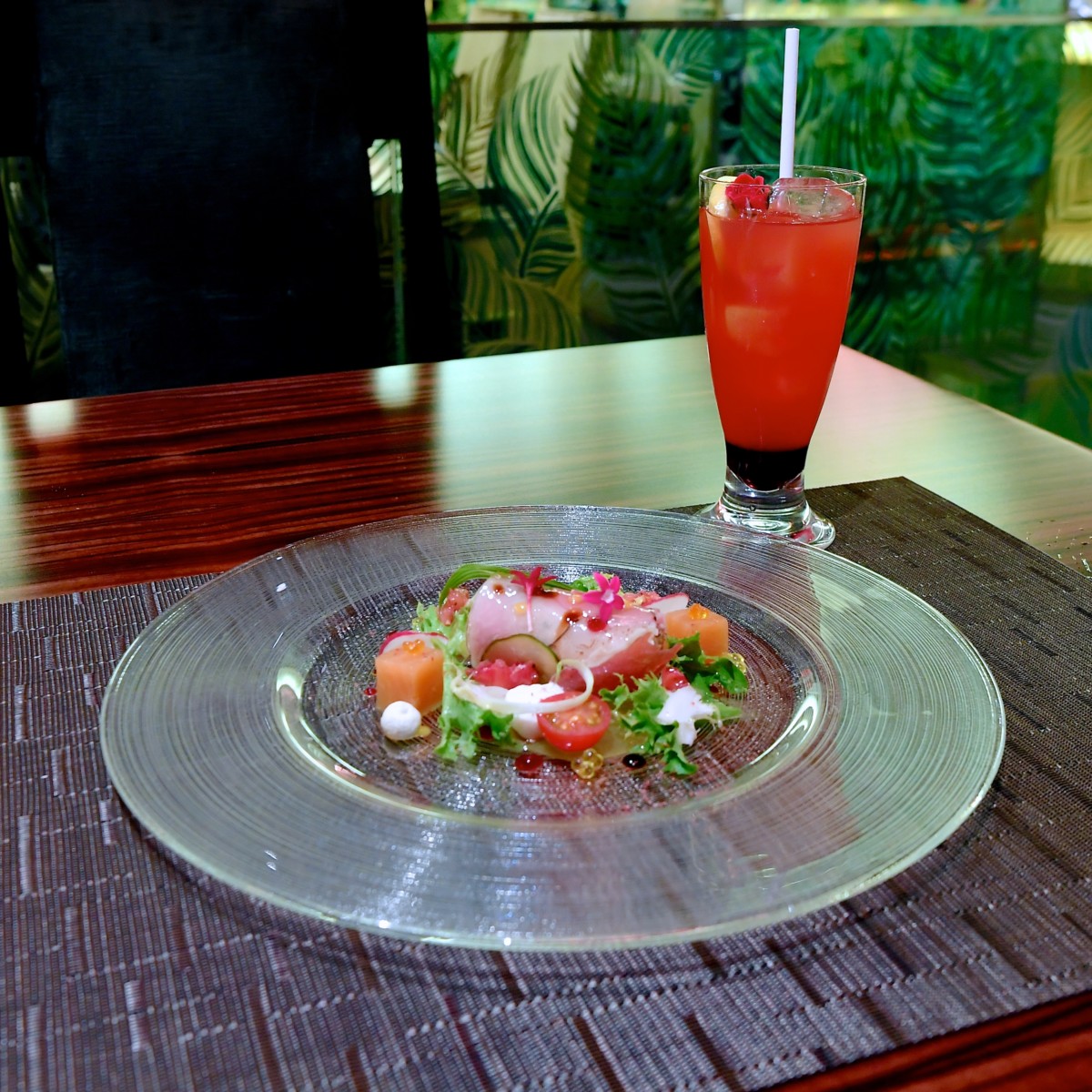 - 帆立貝のラメルと彩り野菜のハーブマリネ イチゴと蕗のとうのサラダ ブッラータのエスプーマとともに