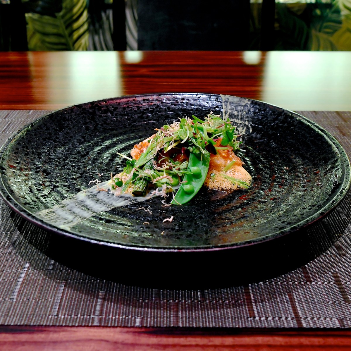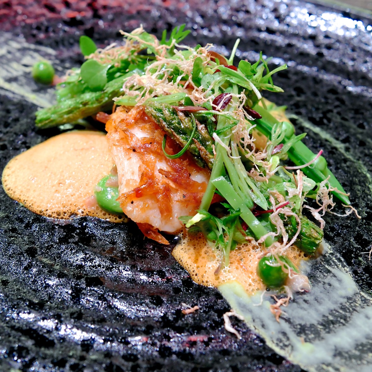 的鯛のふんわり食感と桜海老のカリッとした食感、アスパラガスのソテーや新生姜のフリットなど色鮮やかで豪華なお魚料理です。