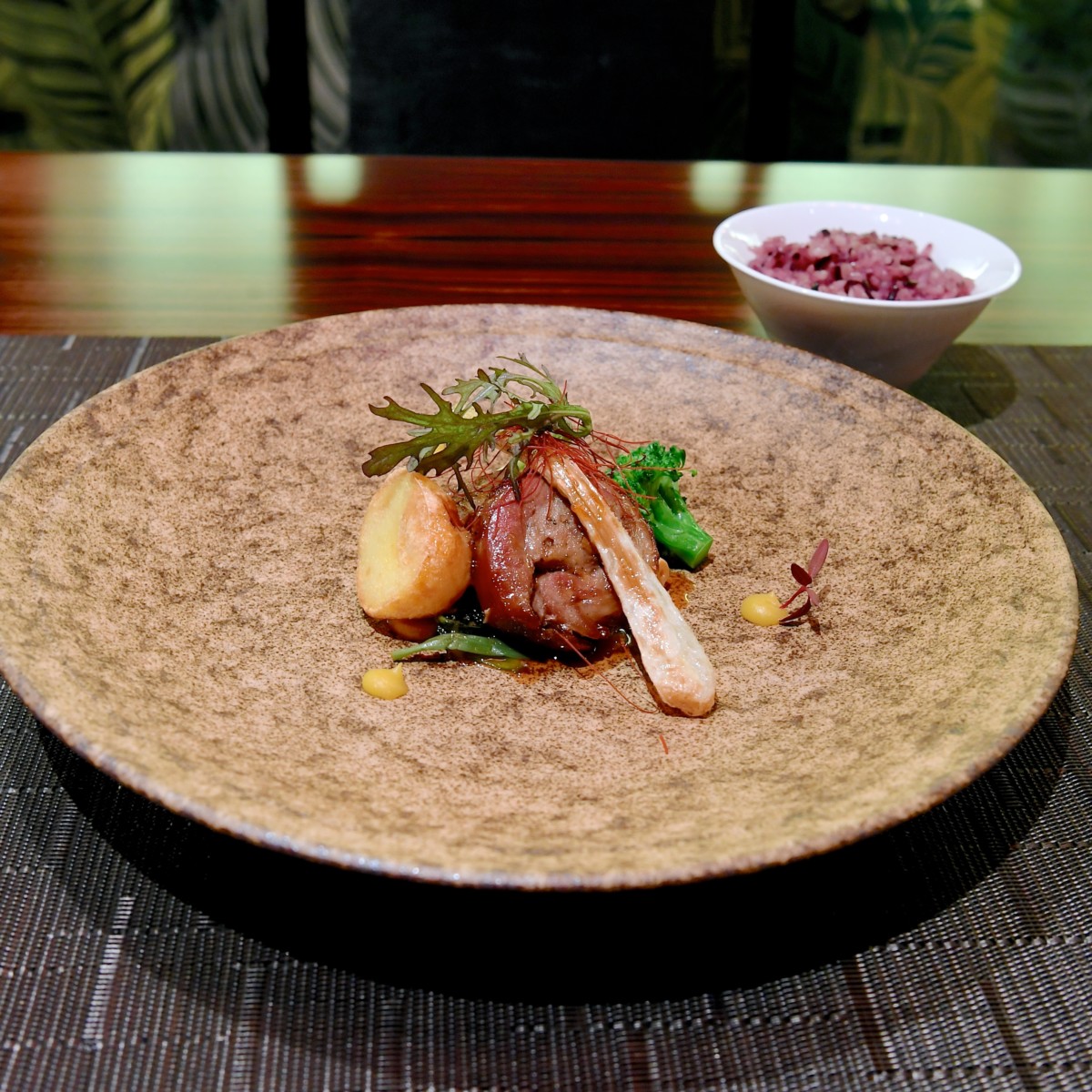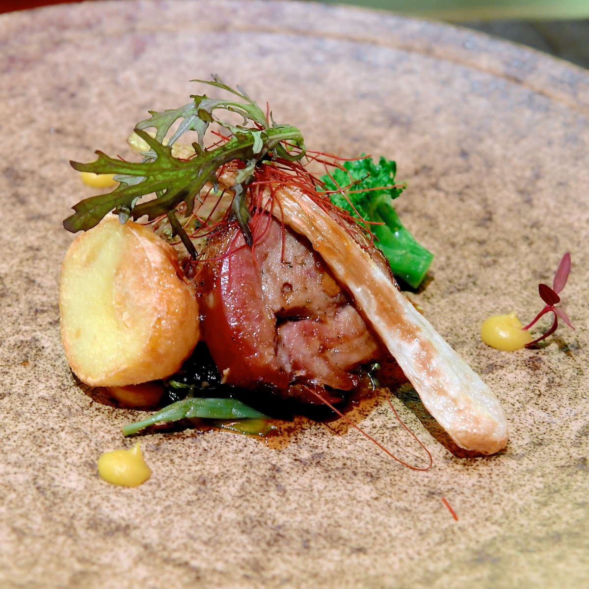 木の芽とナッツを巻いたホロホロ鳥のロースト レモン風味 牛蒡のナムル