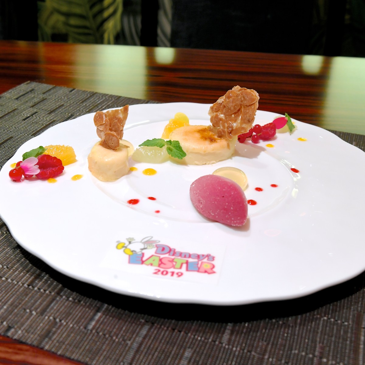 デザートはうさぎの耳がついたいたずら好きで好奇心旺盛なタマゴのキャラクター”うさたま”とディズニー・イースター2019のロゴがデザインされた華やかなプレートで提供されます。