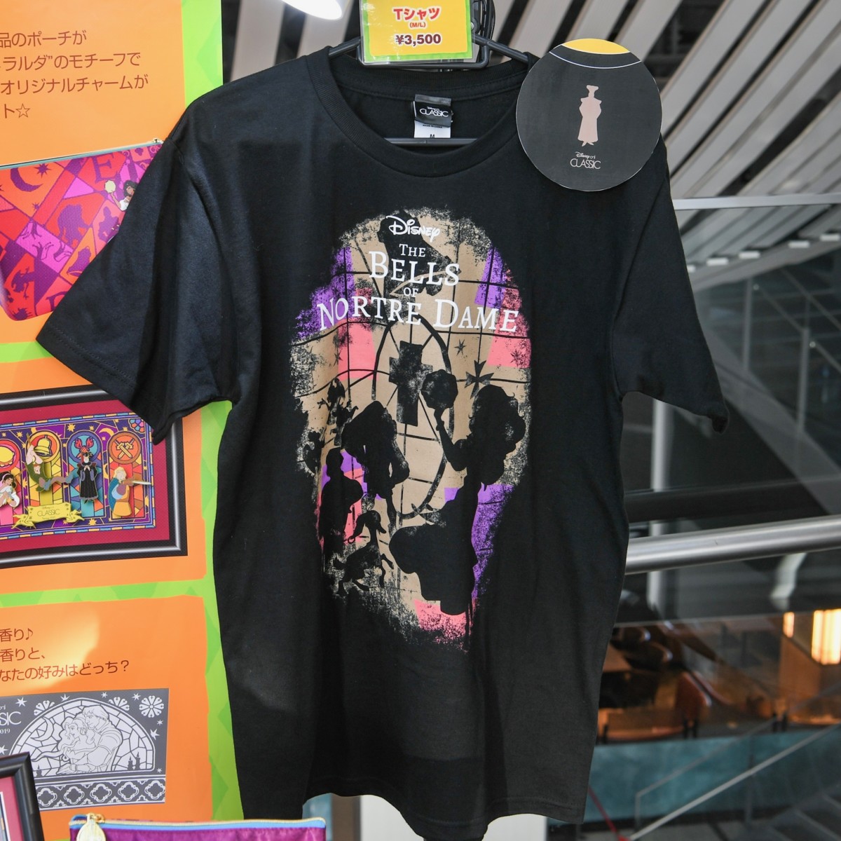 『ノートルダムの鐘』の登場キャラクターのシルエットがおしゃれにデザインされた黒色Tシャツ。