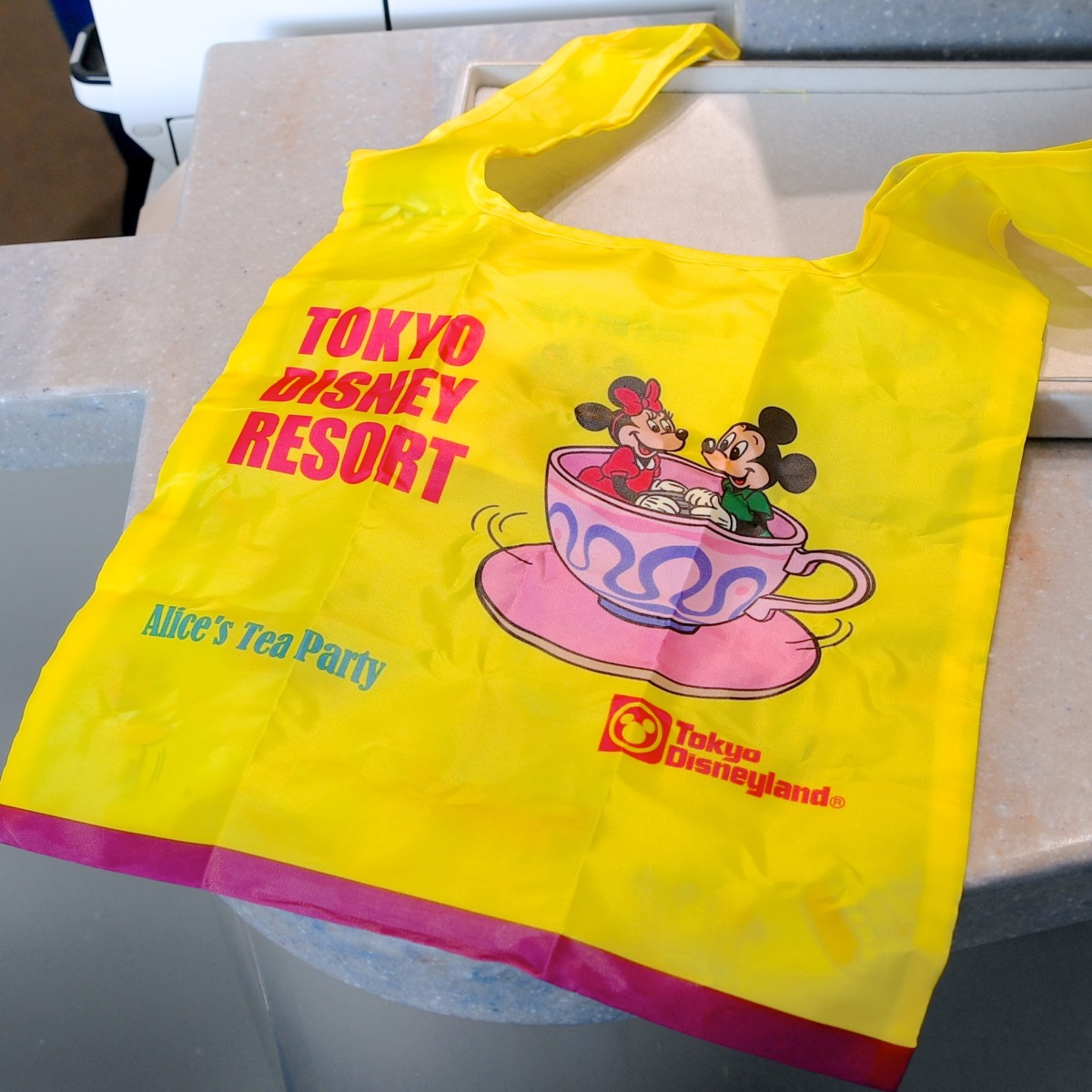 イエロー(黄色)のエコバッグは東京ディズニーランドのアトラクション「アリスのティーパーティー」に乗るミッキーマウスとミニーマウスデザイン。