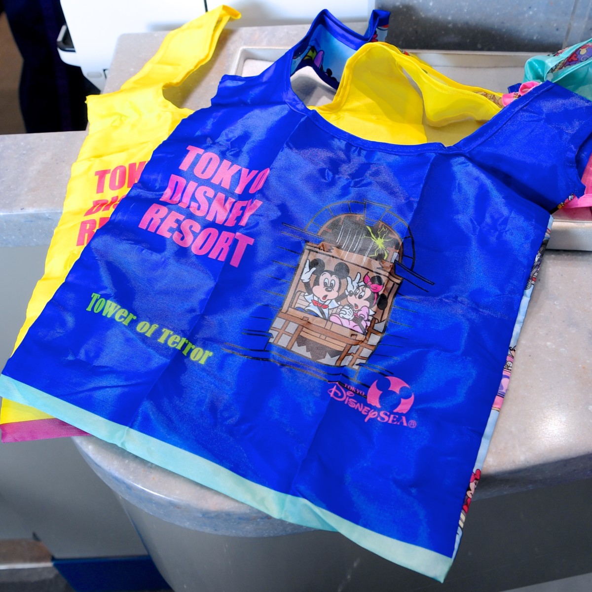 ブルー(青色)のエコバッグは東京ディズニーシーのアトラクション「タワー・オブ・テラー」に乗るミッキーマウスとミニーマウスデザイン。