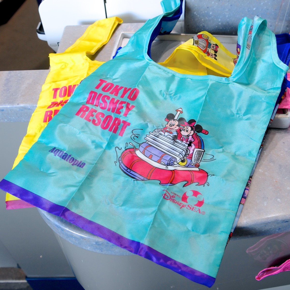 水色のエコバッグは東京ディズニーシーのアトラクション「アクアトピア」に乗るミッキーマウスとミニーマウスデザイン。
