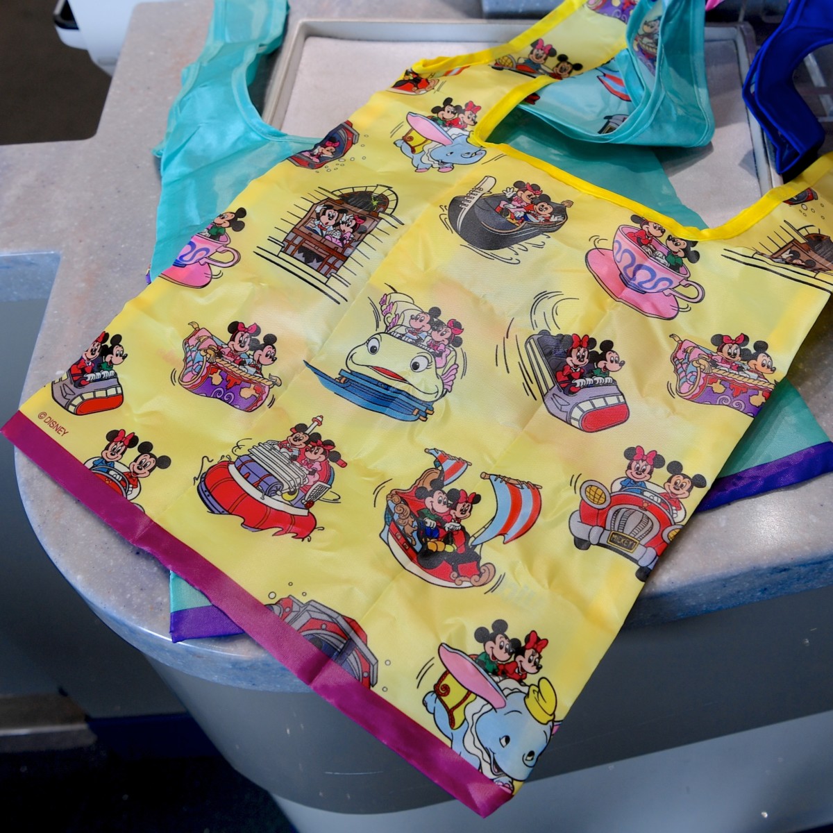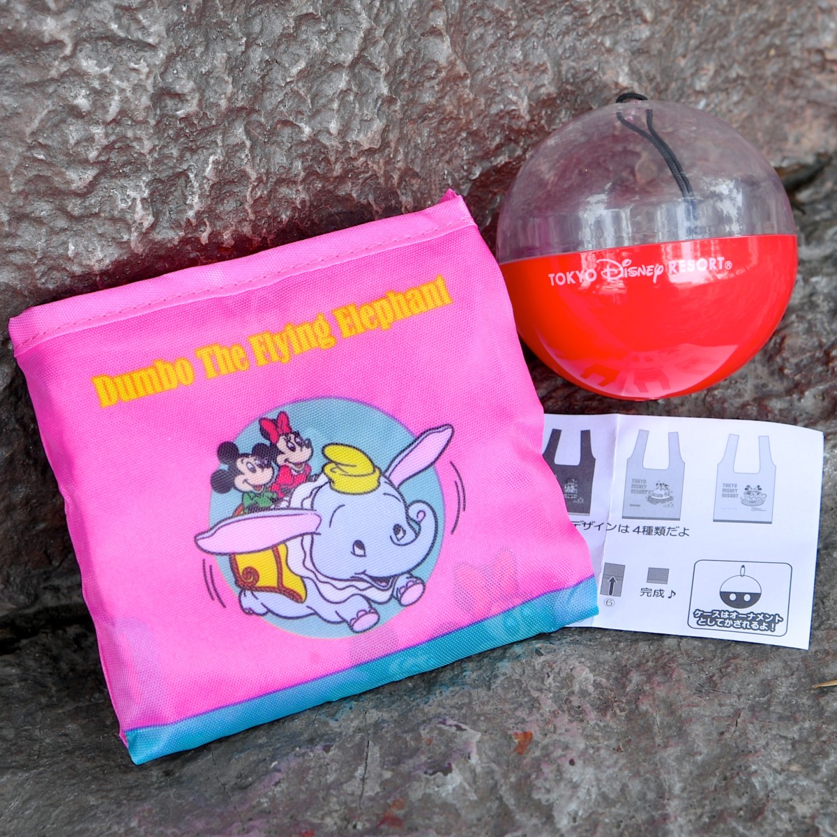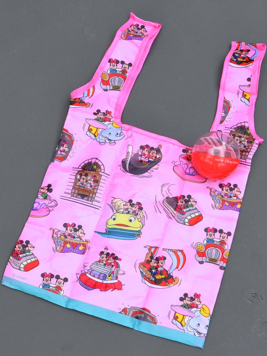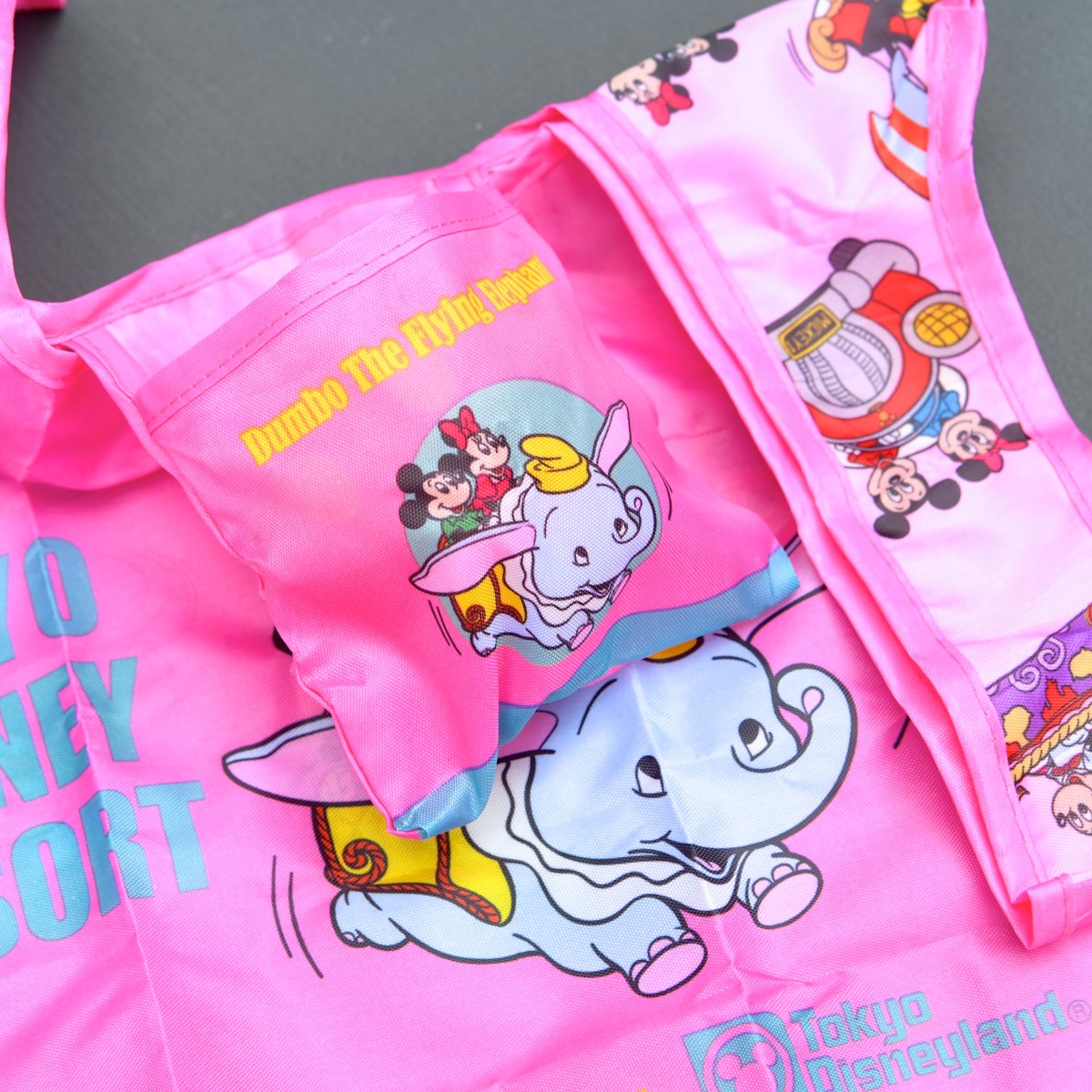 ピンク色のエコバッグは東京ディズニーランドのアトラクション「空飛ぶダンボ」に乗るミッキーマウスとミニーマウスデザイン。