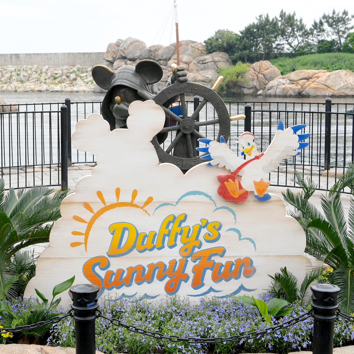 ダッフィーのサニーファンのロゴとミッキー雲、ティッピーブルーのフォトロケーション。