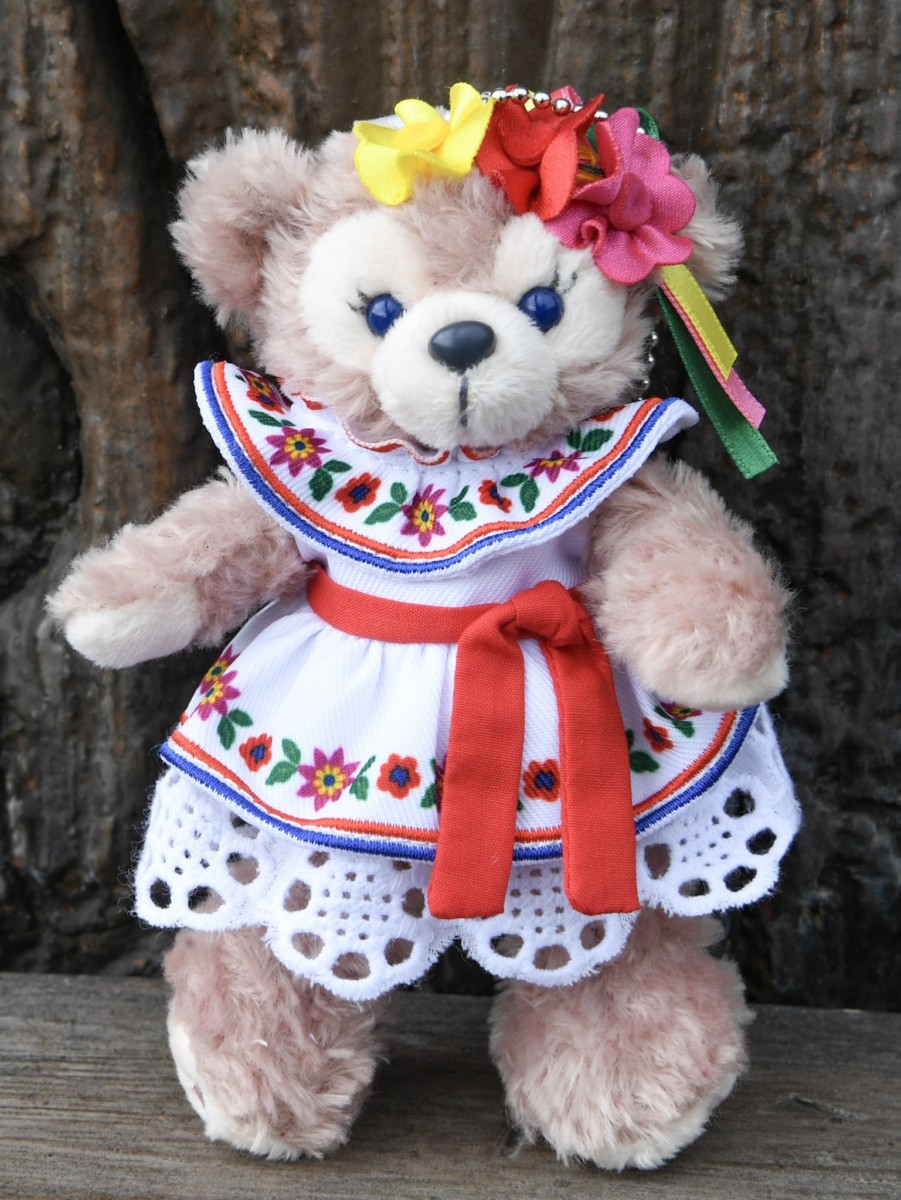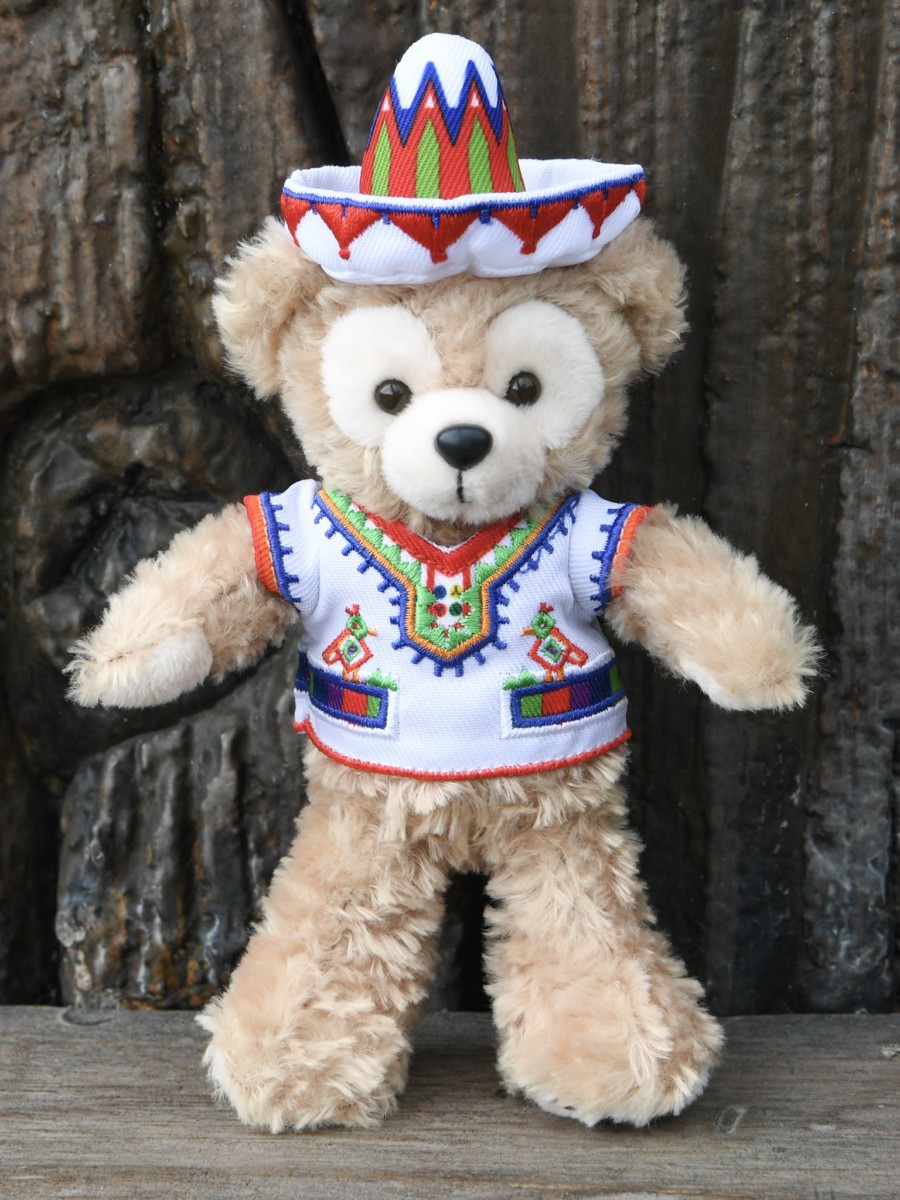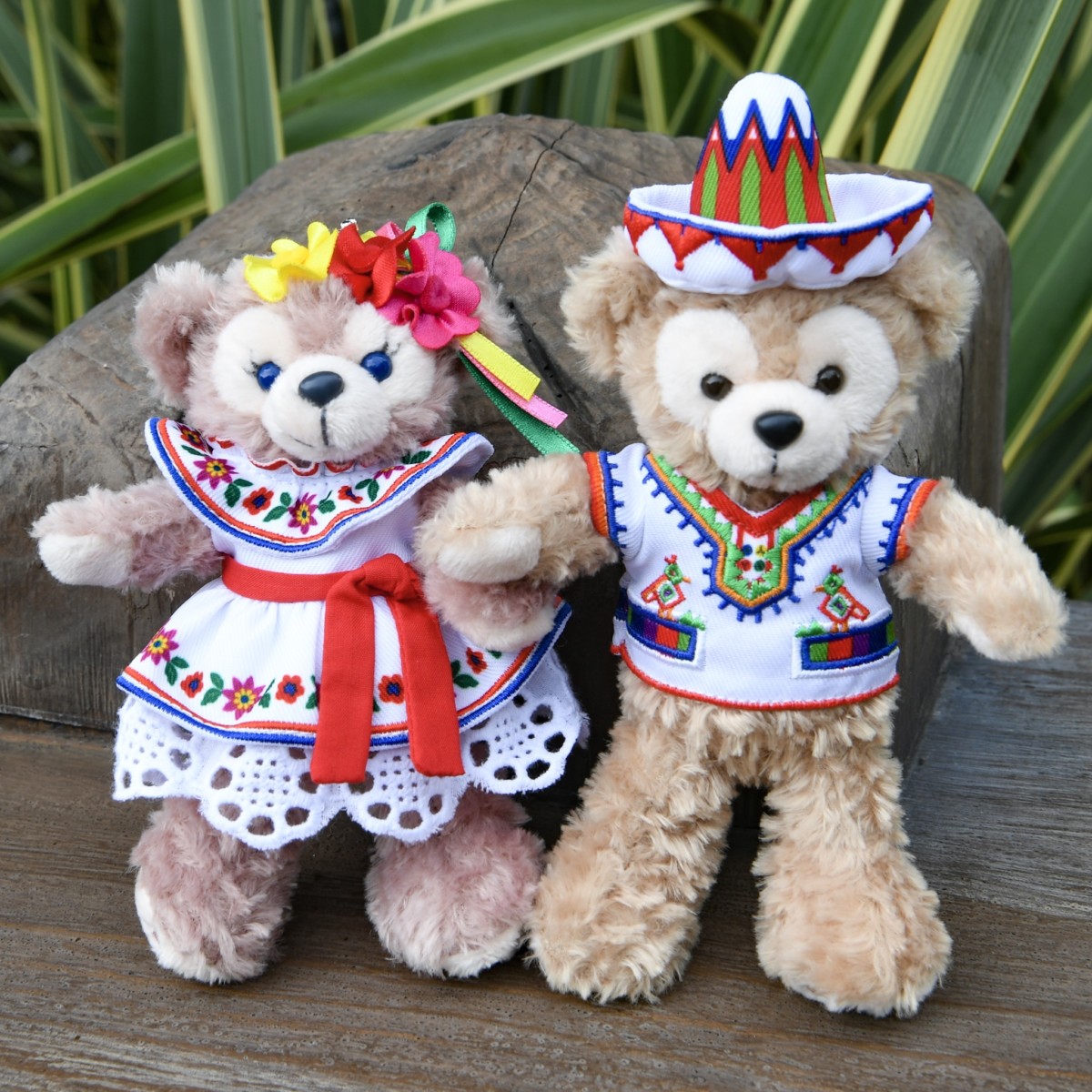 ラテンアメリカ風コスチュームのダッフィー、シェリーメイのぬいぐるみバッジを持って会いに行きたいですね☆