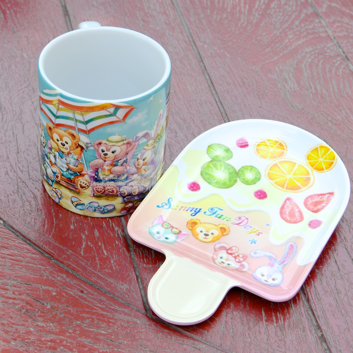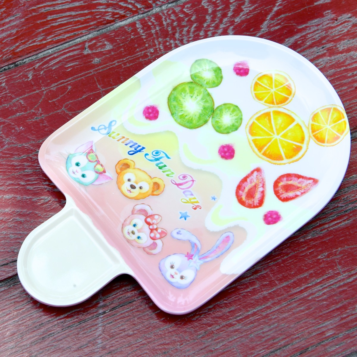 「ダッフィー」、「シェリーメイ」、「ジェラトーニ」、「ステラ・ルー」のお顔とミッキーマークのフルーツが色鮮やかに描かれています。