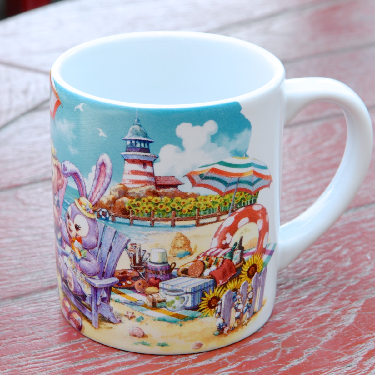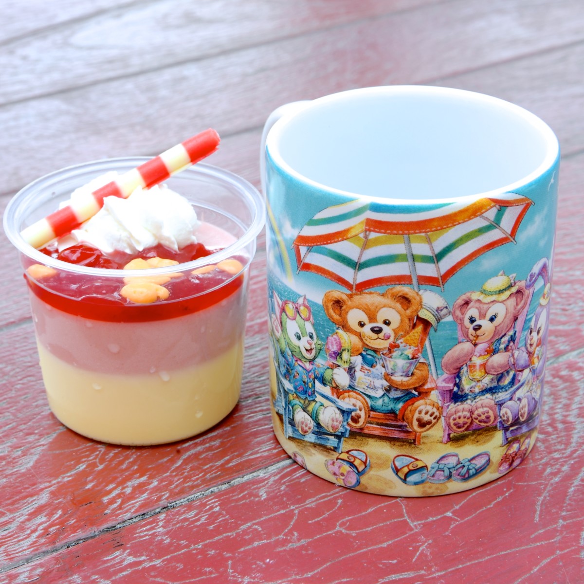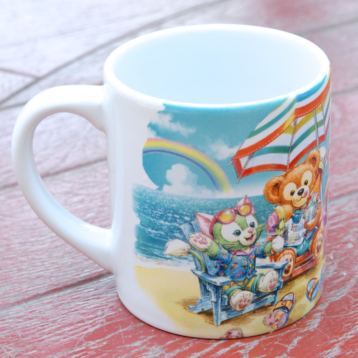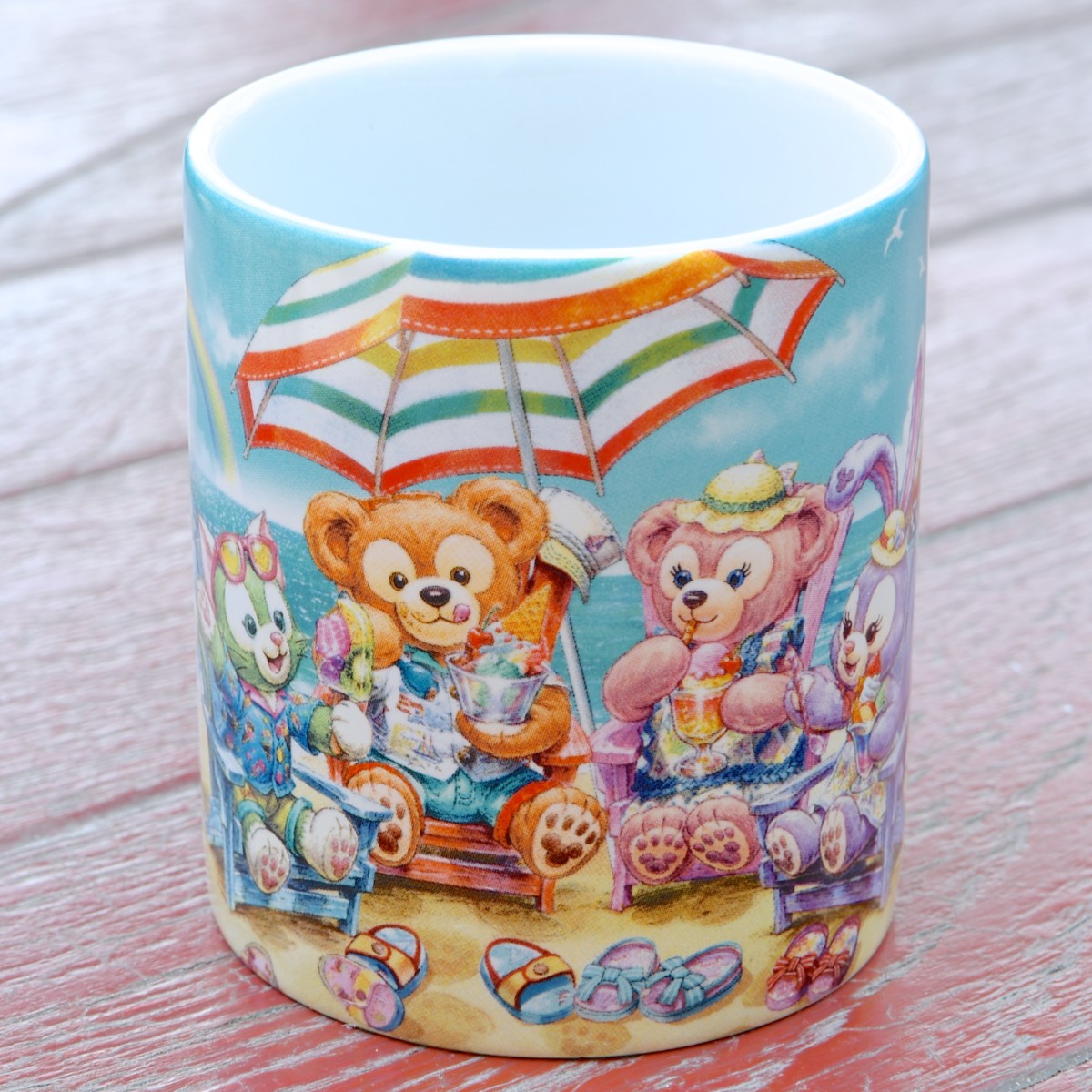 砂浜で夏を楽しむ「ダッフィー&フレンズ」がデザインされたスーベニアカップ。