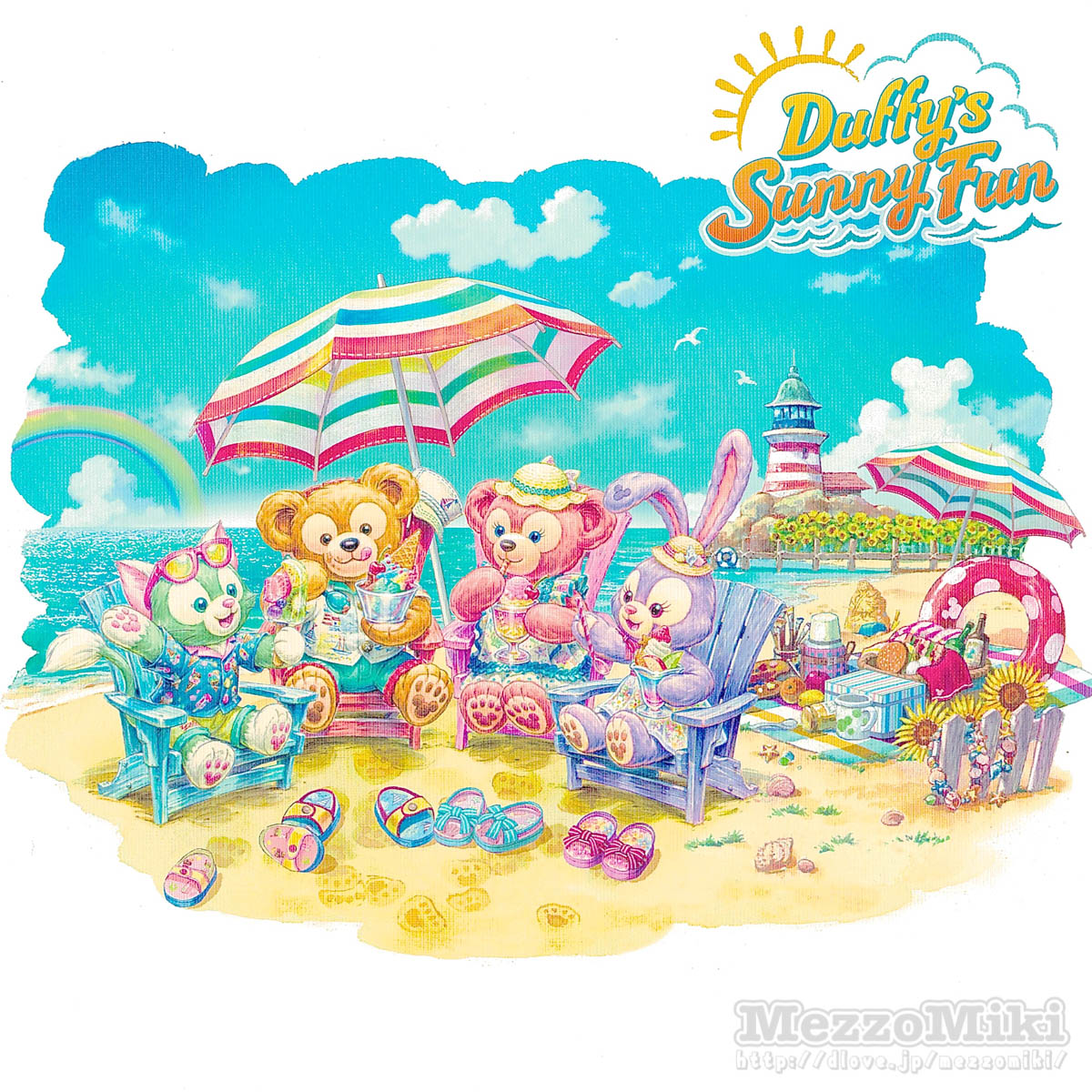 砂浜でデザートを食べているダッフィー、シェリーメイ、ジェラトーニ、ステラ・ルーがデザインされています。