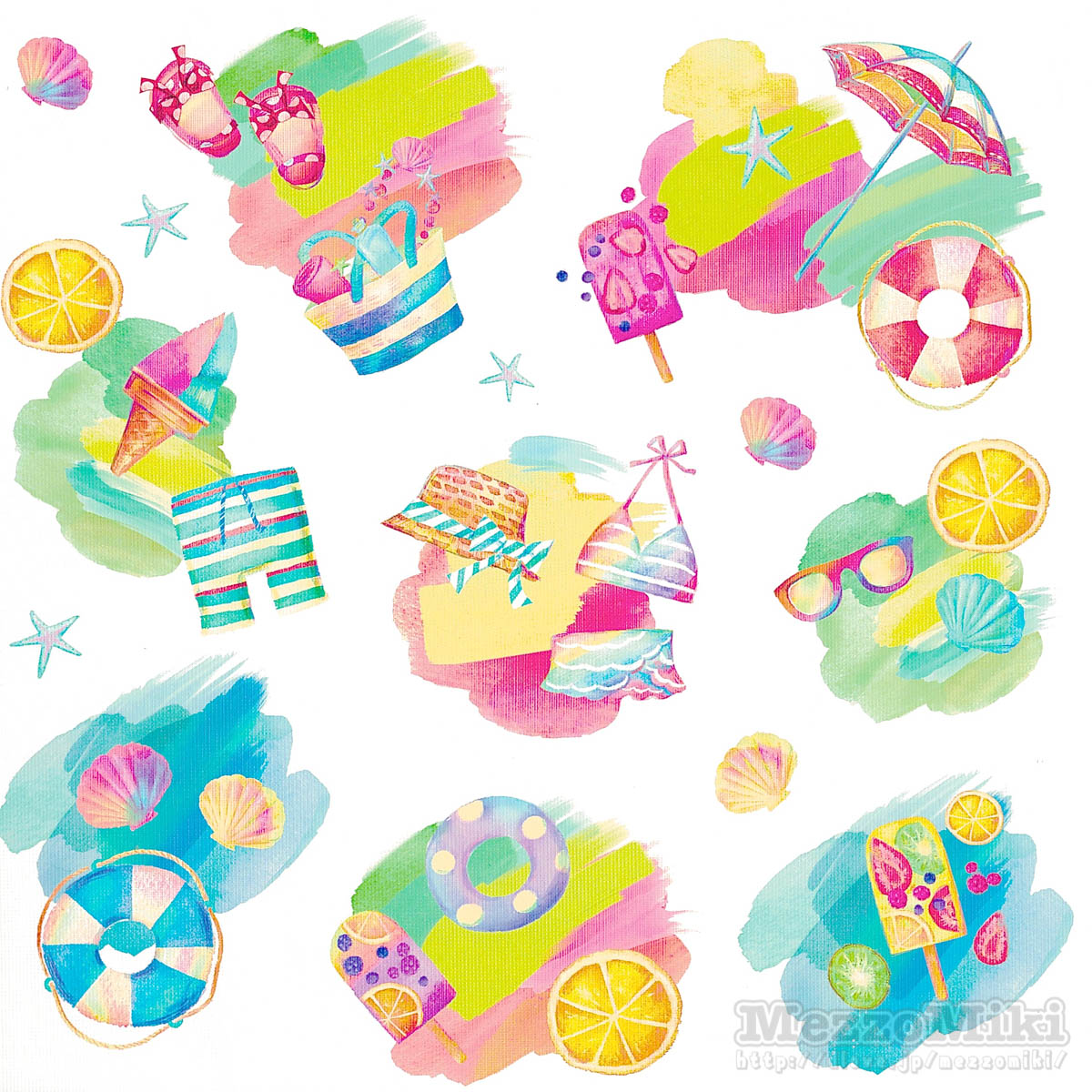 スイーツや夏らしいモチーフに囲まれたデザインのかわいいグッズ・お土産やメニューが登場。
