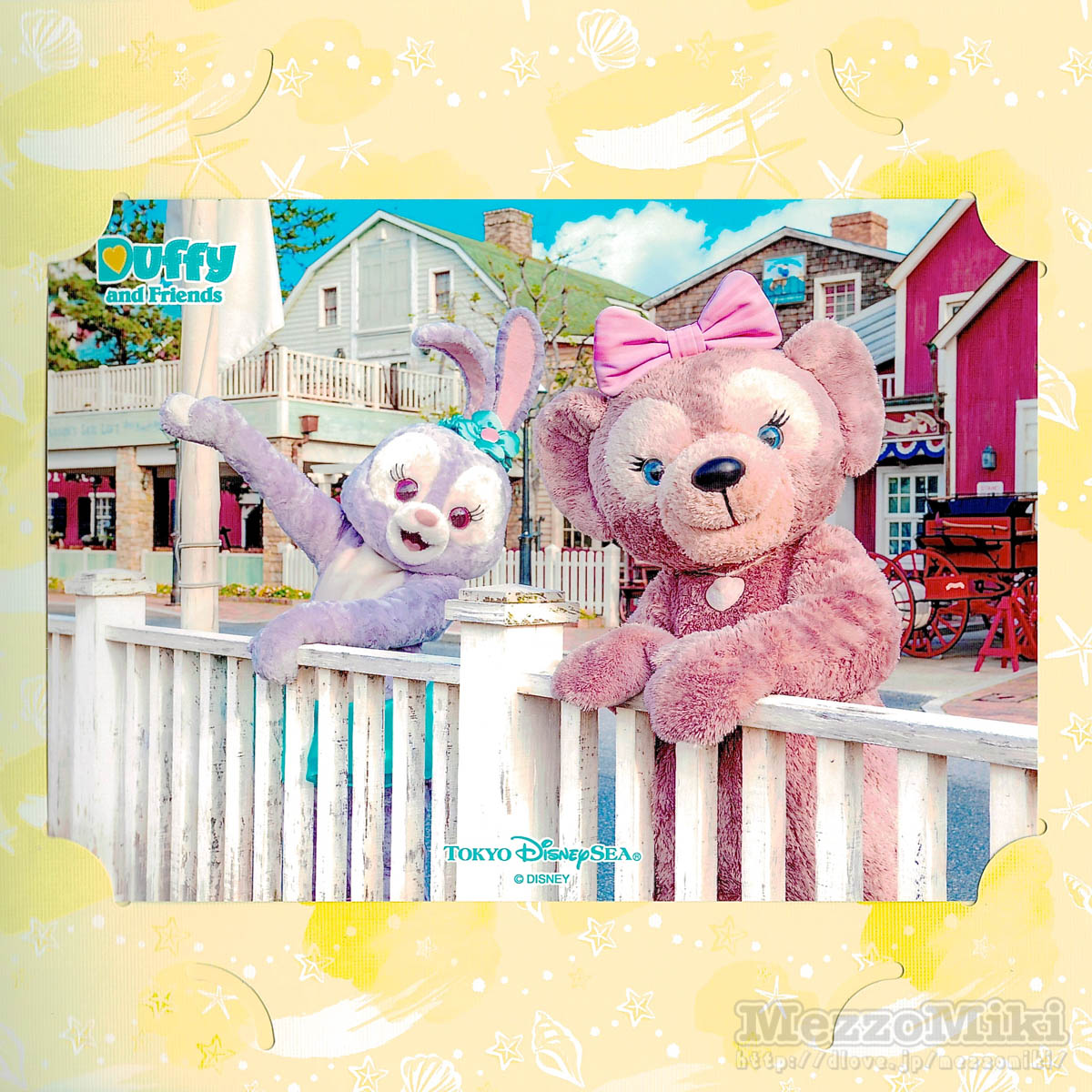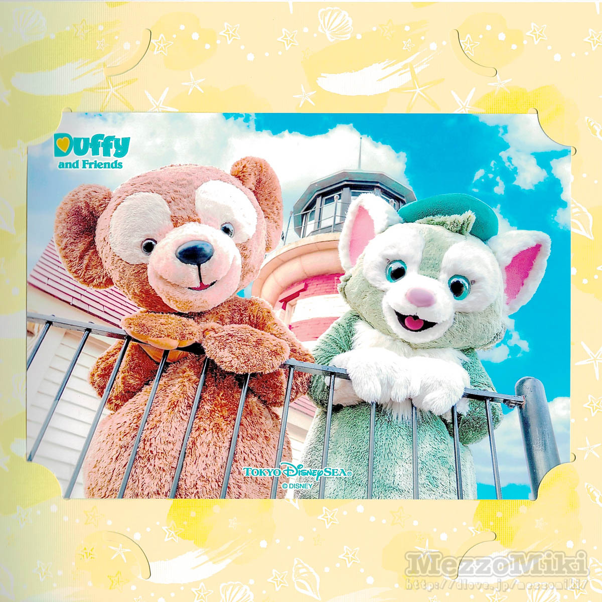 シェリーメイグリーティングの台紙の写真は灯台の麓でポーズをとる「ダッフィー」&「ジェラトーニ」