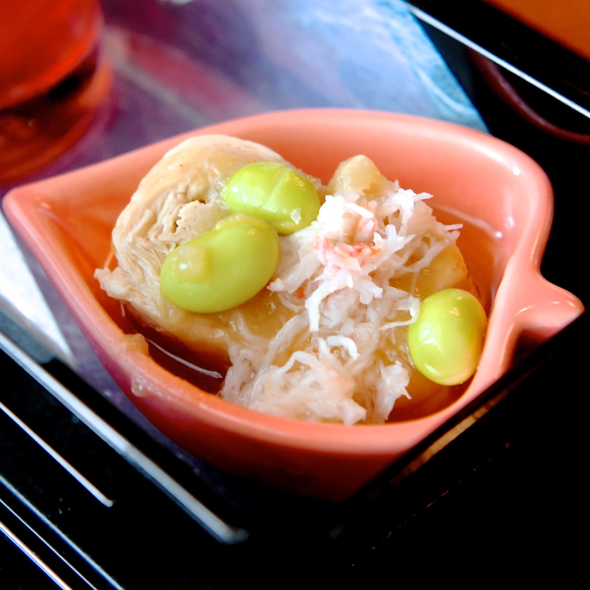 さっぱりした焼き湯葉の茄子のあんかけ。