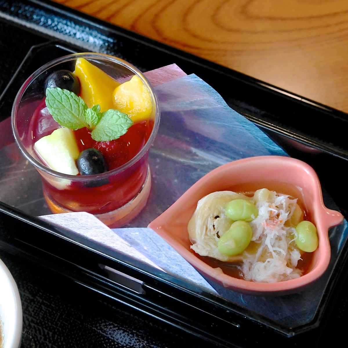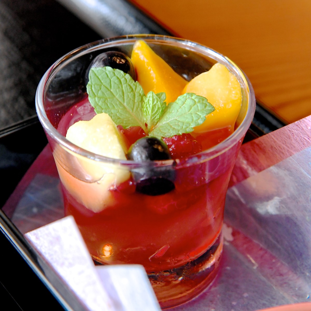 ところてん風なアセロラゼリーとフルーツのグラスデザート。