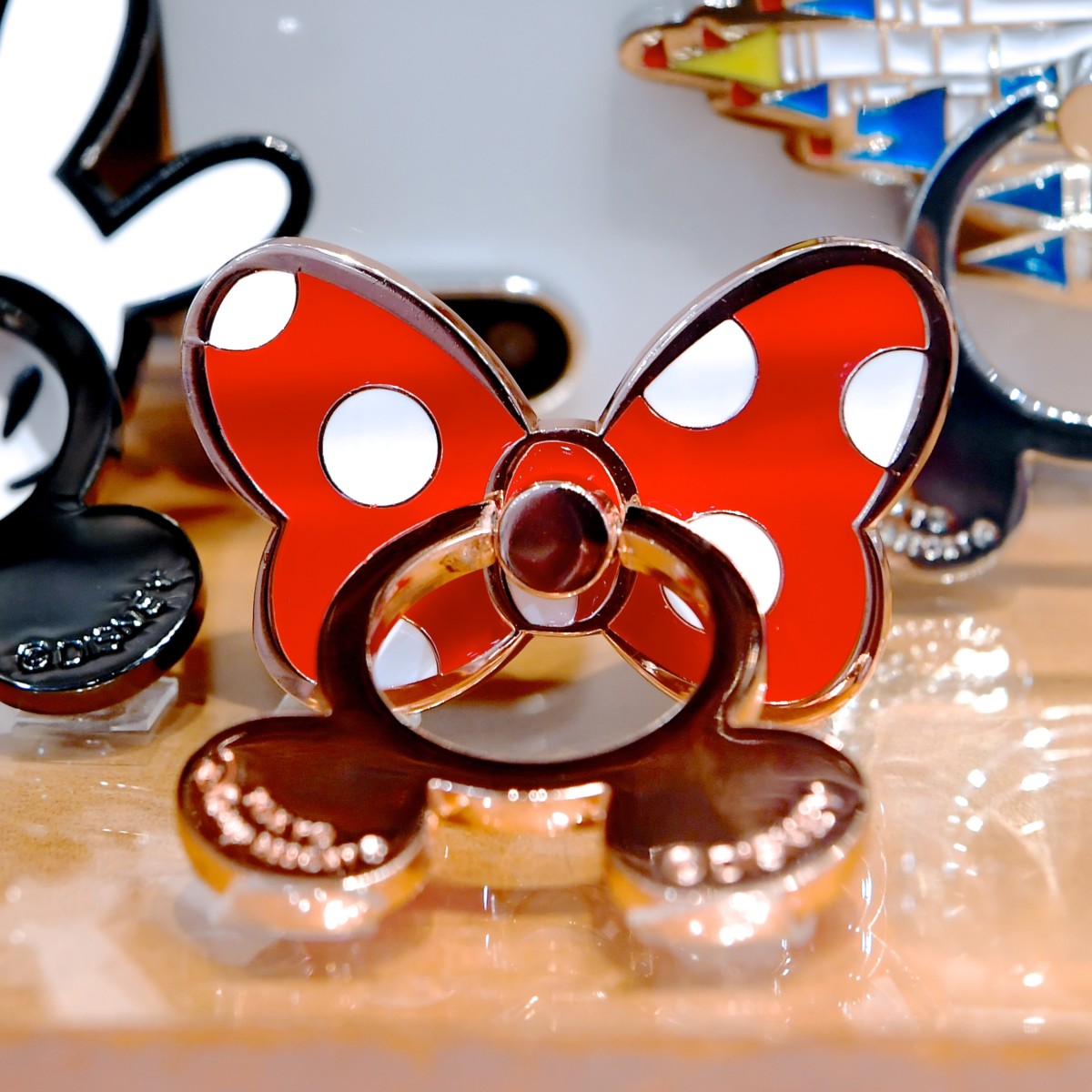「ミニーマウス」のトレードマークであるドット柄のリボンデザインのスマホリング(バンカーリング)