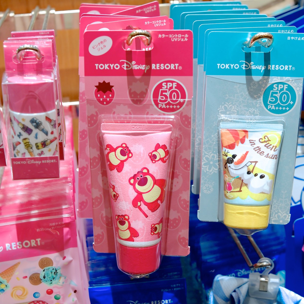 東京ディズニーランド、東京ディズニーシーではかわいいディズニーキャラクターデザインの日焼け止めを種類豊富に販売中。