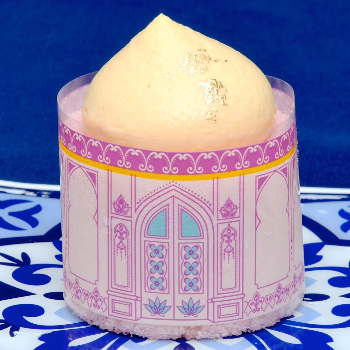 『アラジン』のキーアイテム「魔法のランプ」のプチケーキはマンゴーとココナッツのムース。