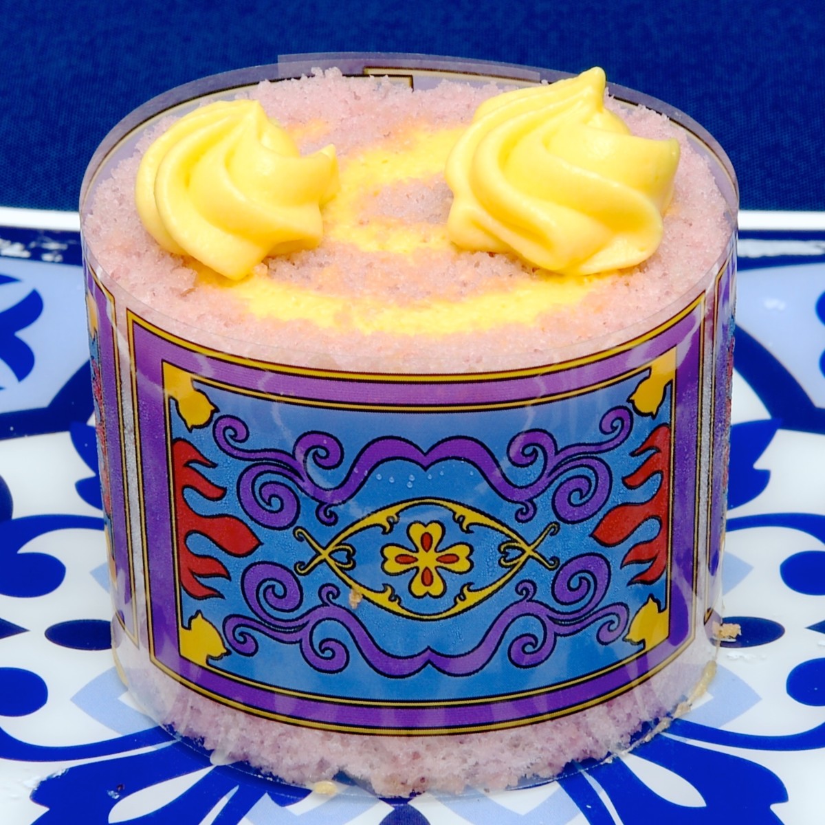 『アラジン』で大活躍する「魔法の絨毯」のプチケーキはレモン風味クリームとブルーベリー風味スポンジのロールケーキ。