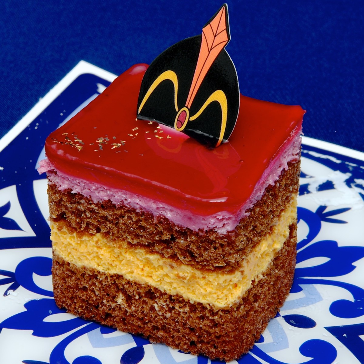 『アラジン』のディズニーヴィランズ「ジャファー」のプチケーキはカシスクリームとマンゴークリームのケーキ。