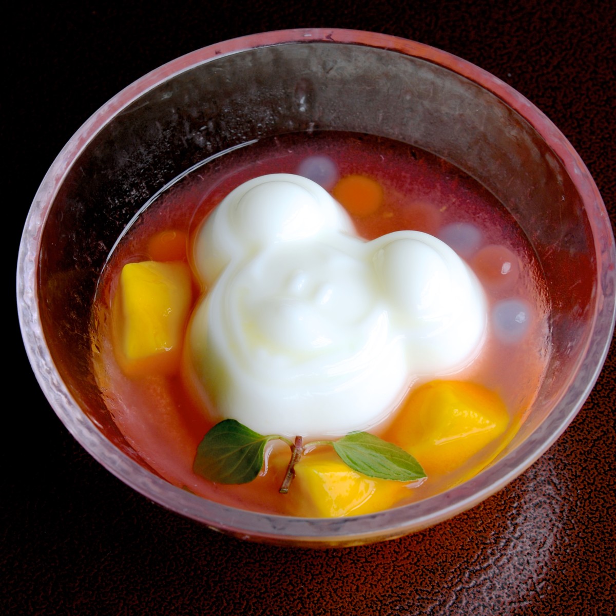 マンゴーの果実の他カラフルな味付きタピオカがたっぷりはいっています☆