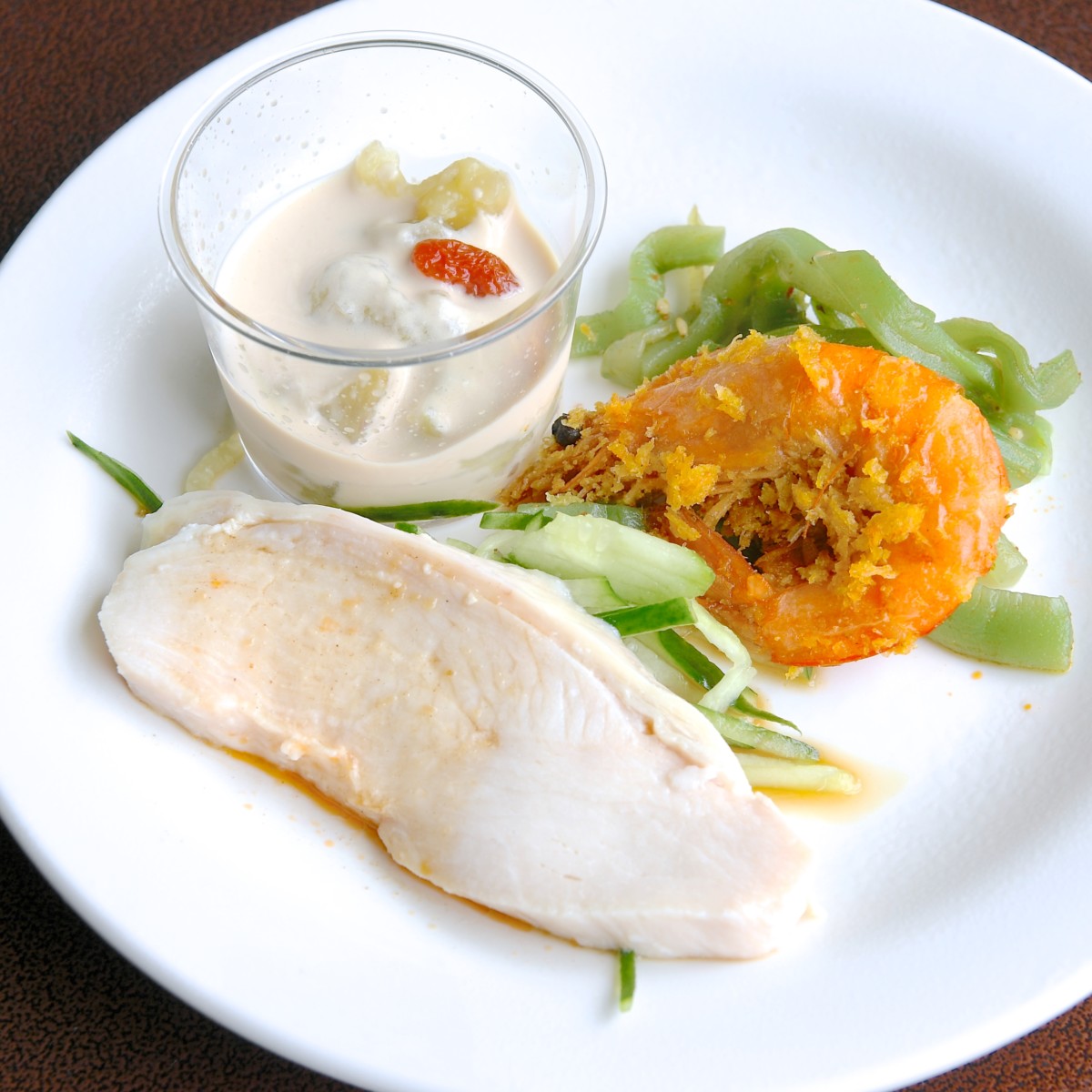- 蒸し鶏の四川風ソース、スパイシーシュリンプ、ナスの胡麻ソース