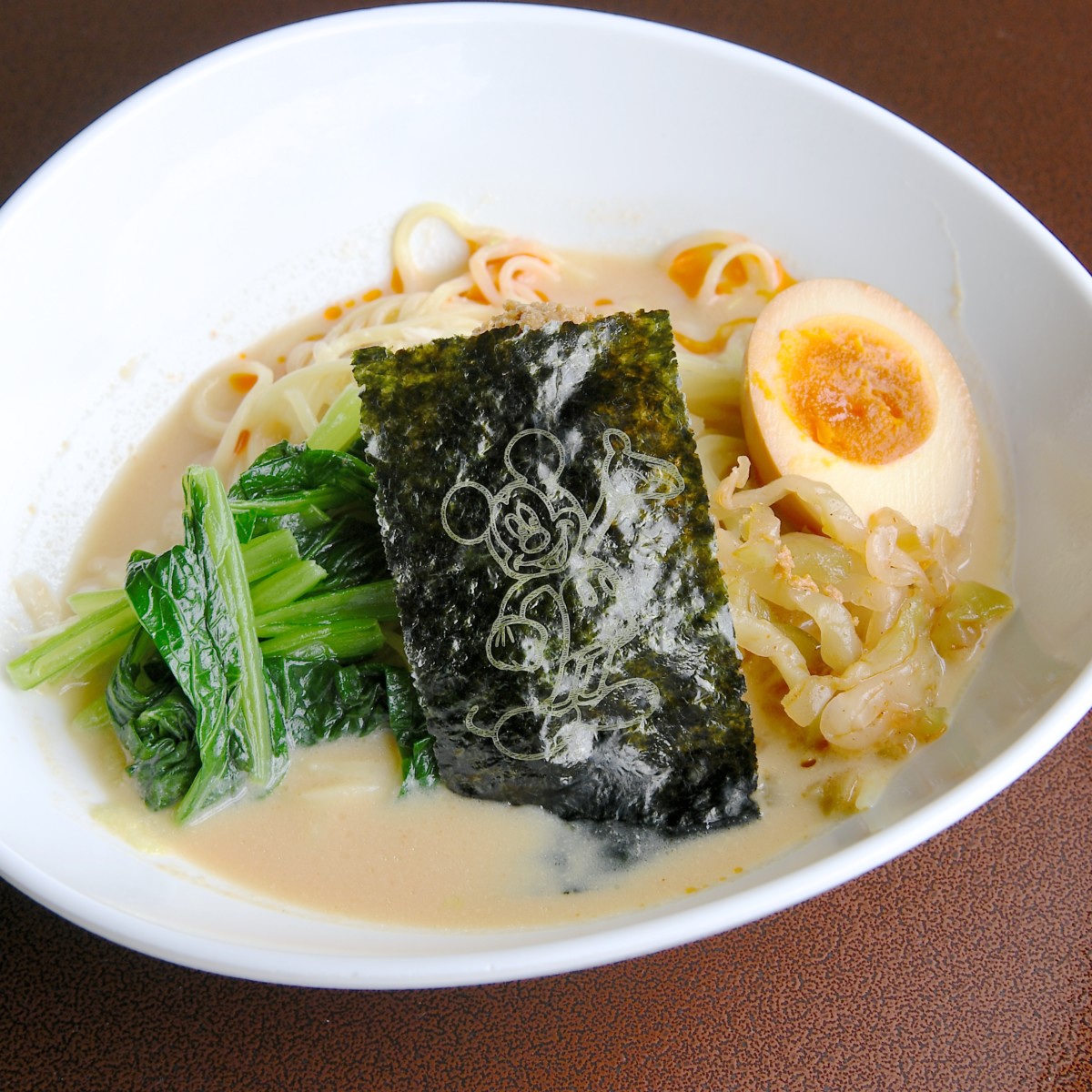 「ミッキーマウス」がデザインされた海苔のほか、肉味噌、青菜、ザーサイ、味付け玉子もトッピングされています。