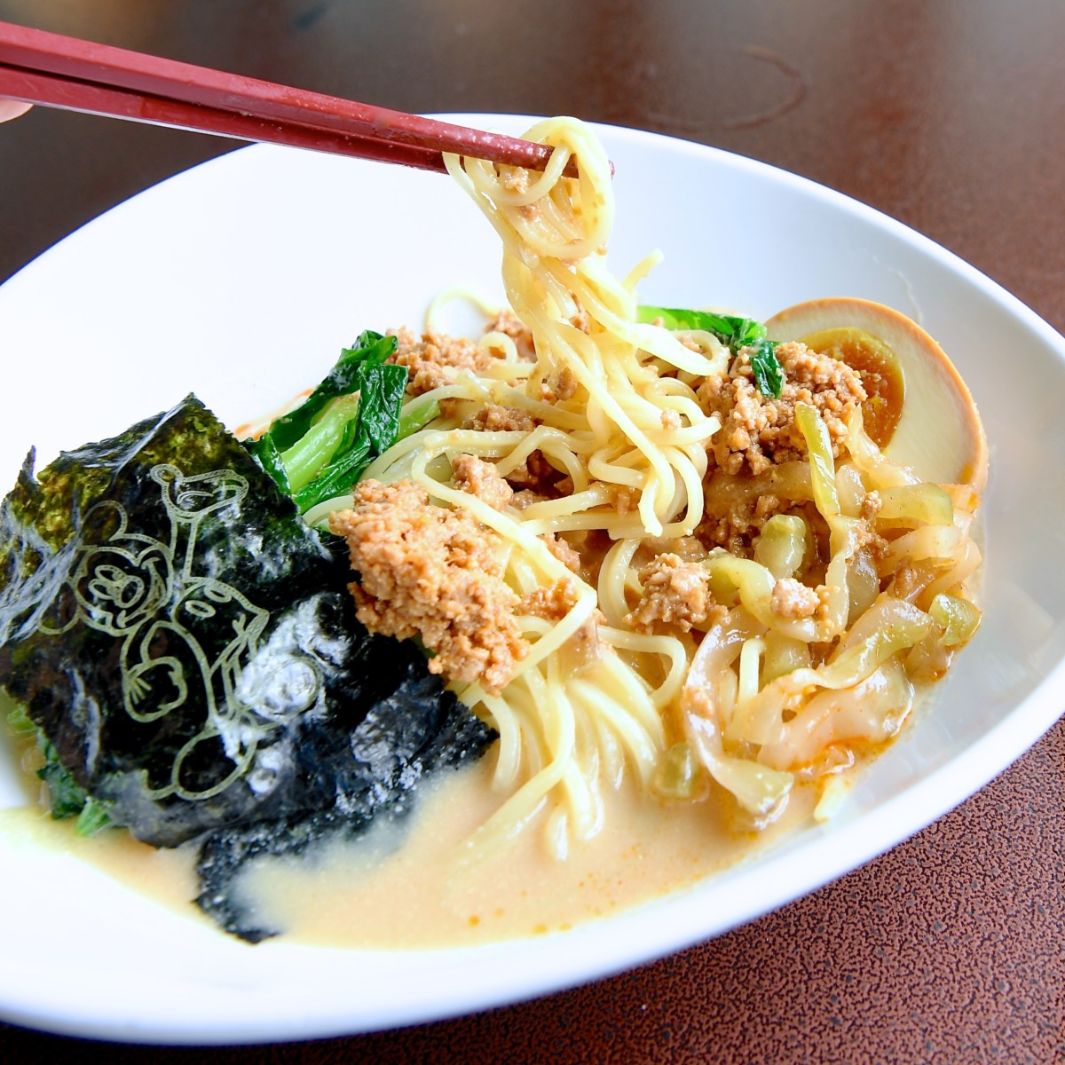 ミッキーマウスがデザインされた海苔がトッピングされたピリ辛な担々麺風冷やし麺。
