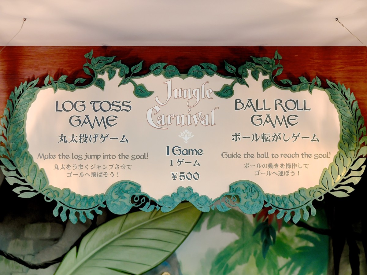 「丸太投げゲーム」と「ボール転がしゲーム」の2種のゲームが楽しめるショップ「ジャングルカーニバル」