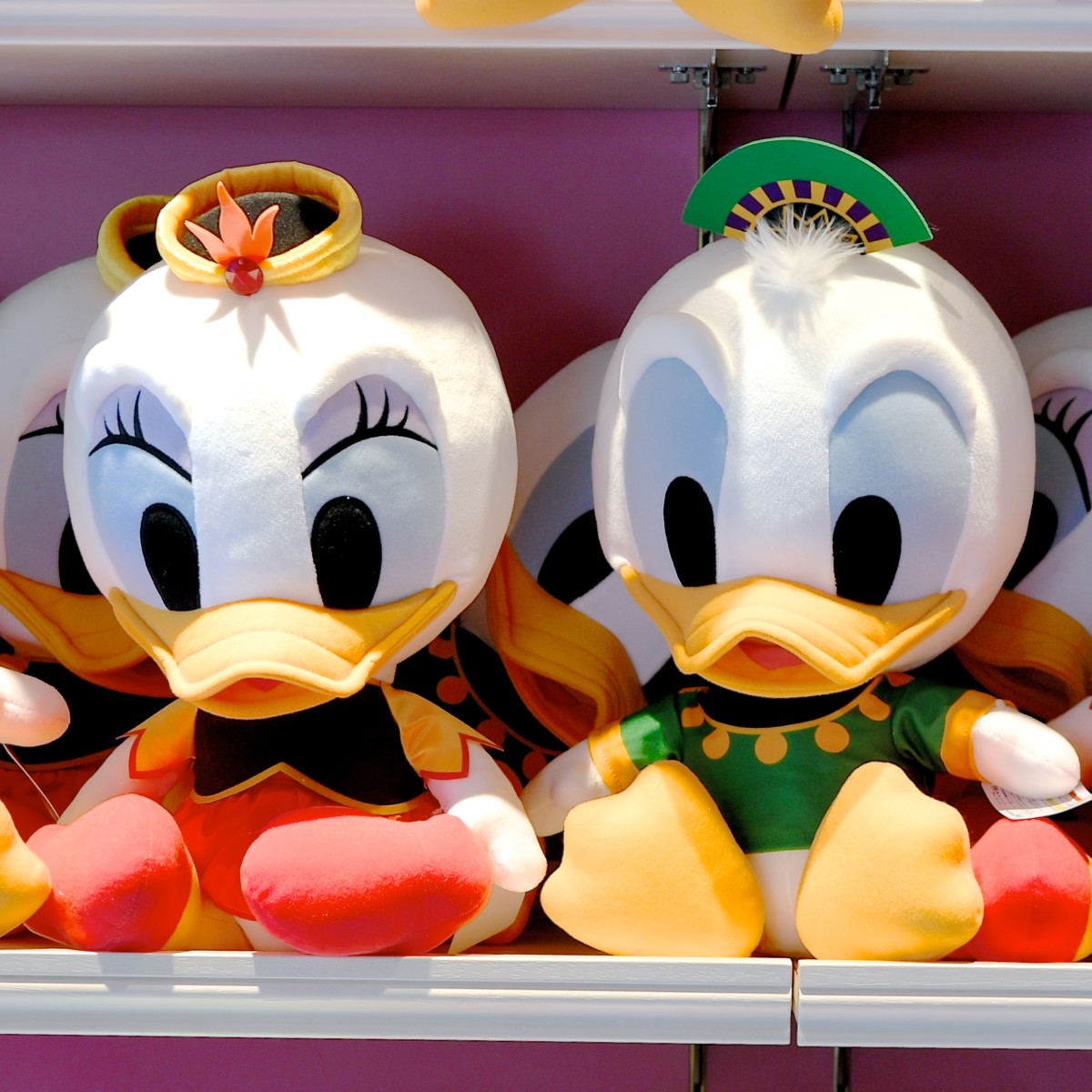 ジャングル風コスチュームのドナルドと情熱的なコスチュームのデイジーのぬいぐるみです。