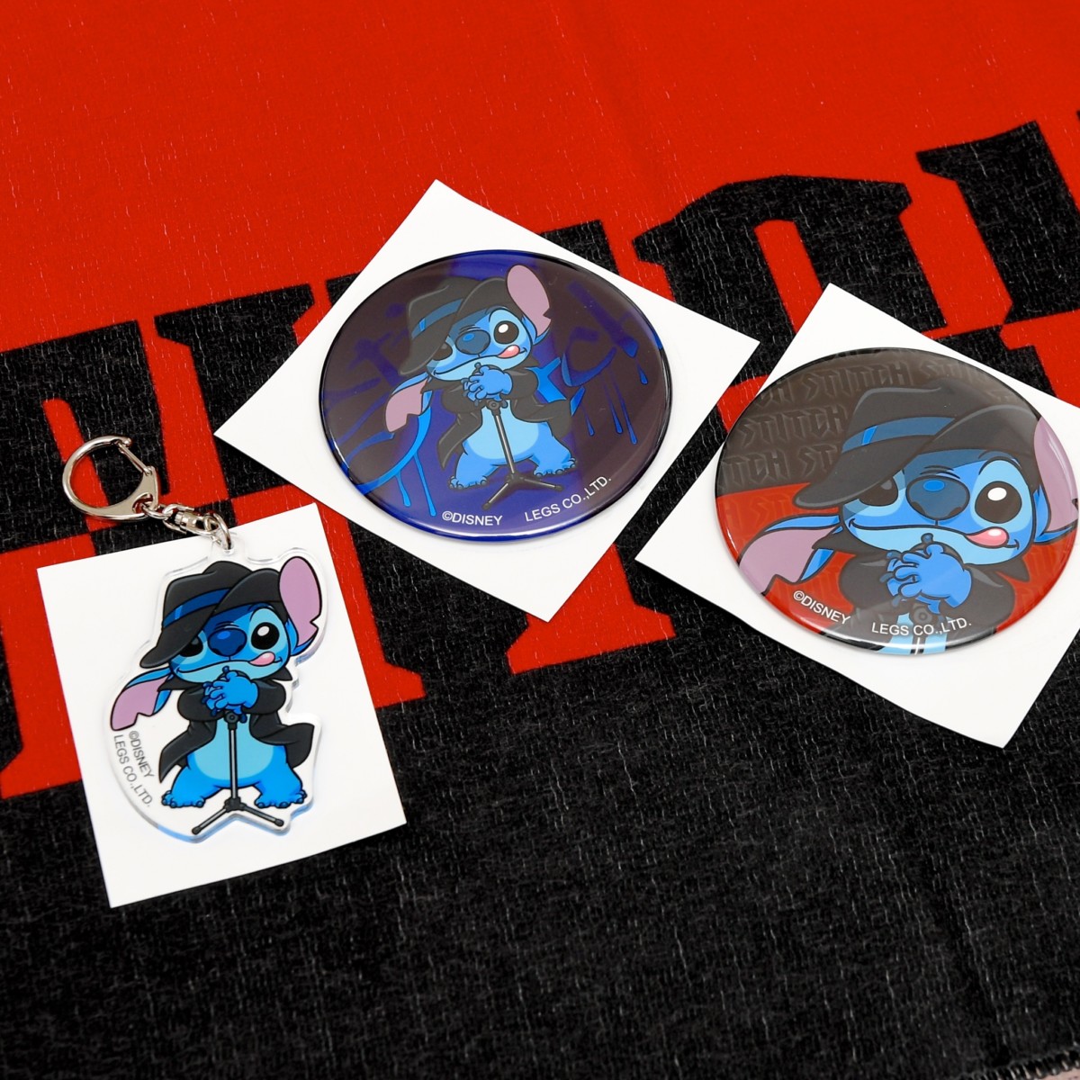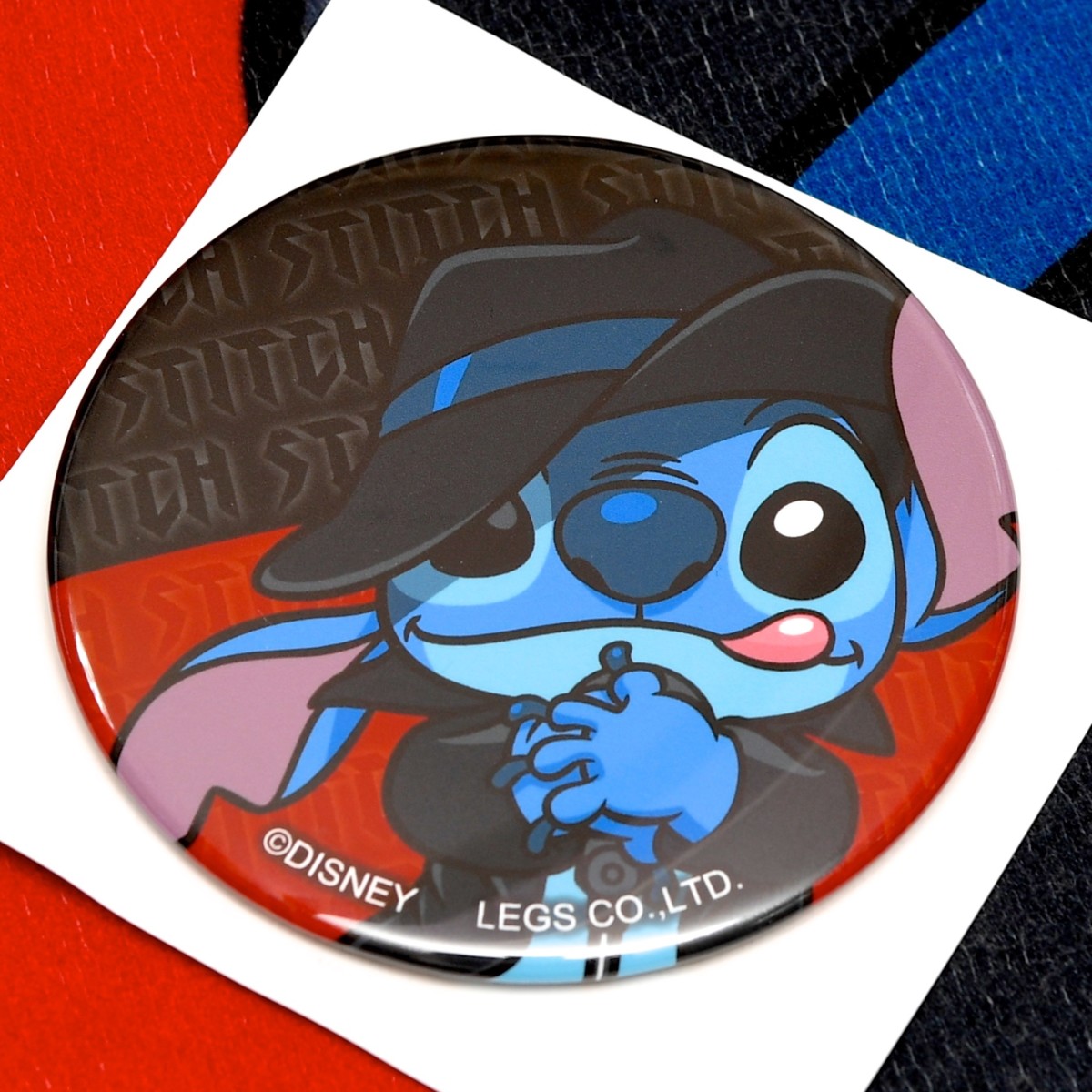 レッドとブラックにスティッチの名前総柄、アップデザインがかわいい缶バッジ。