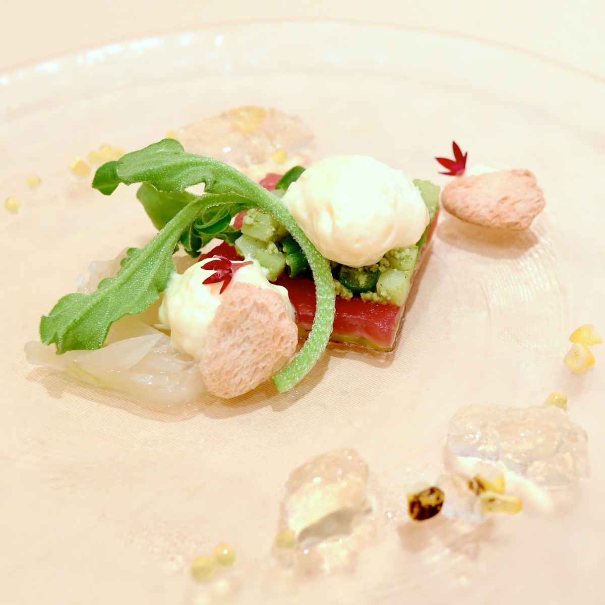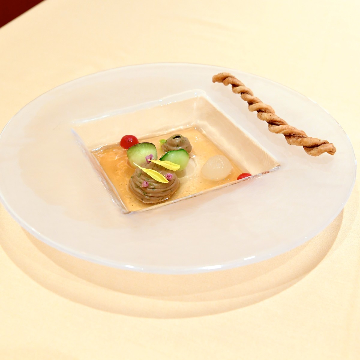 紫蘇とナスのムース、冬瓜、きゅうり、マイクロトマト、コンソメジュレを一緒に楽しめる夏らしいメニュー。