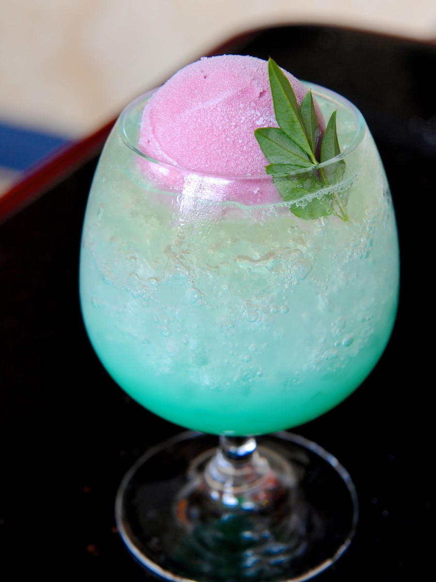 カルピス、メロンシロップ、ブルーシロップ、レモンゼリー、クラブソーダのシュワッとさっぱりいただけるドリンクにグレープソルべがトッピングされています。